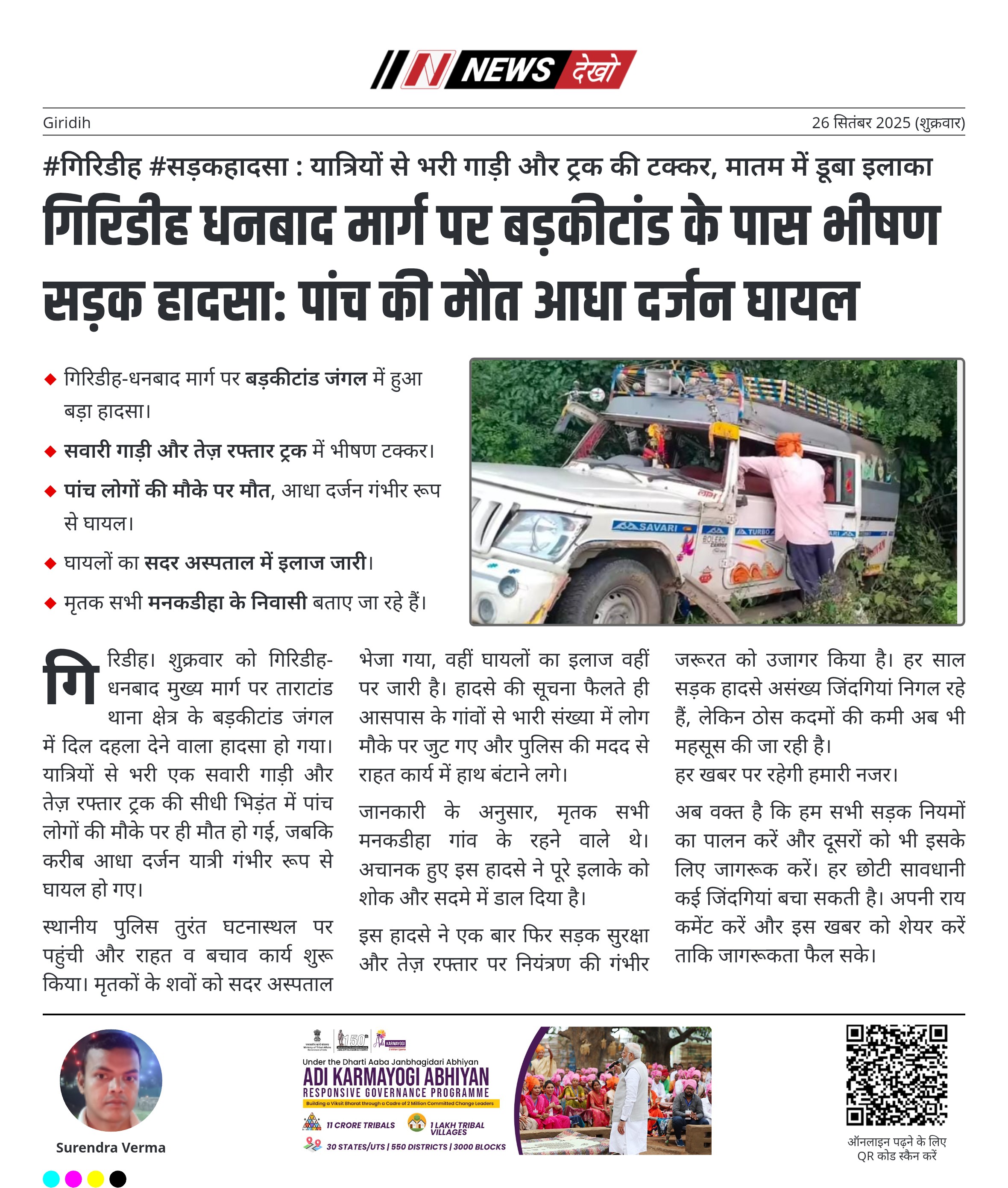 गिरिडीह। शुक्रवार को गिरिडीह-धनबाद मुख्य मार्ग पर ताराटांड थाना क्षेत्र के बड़कीटांड जंगल में दिल दहला देने वाला हादसा हो गया। यात्रियों से भरी एक सवारी गाड़ी और तेज़ रफ्तार ट्रक की सीधी भिड़ंत में पांच लोगों की मौके पर ही मौत हो गई, जबकि करीब आधा दर्जन यात्री गंभीर रूप से घायल हो गए।