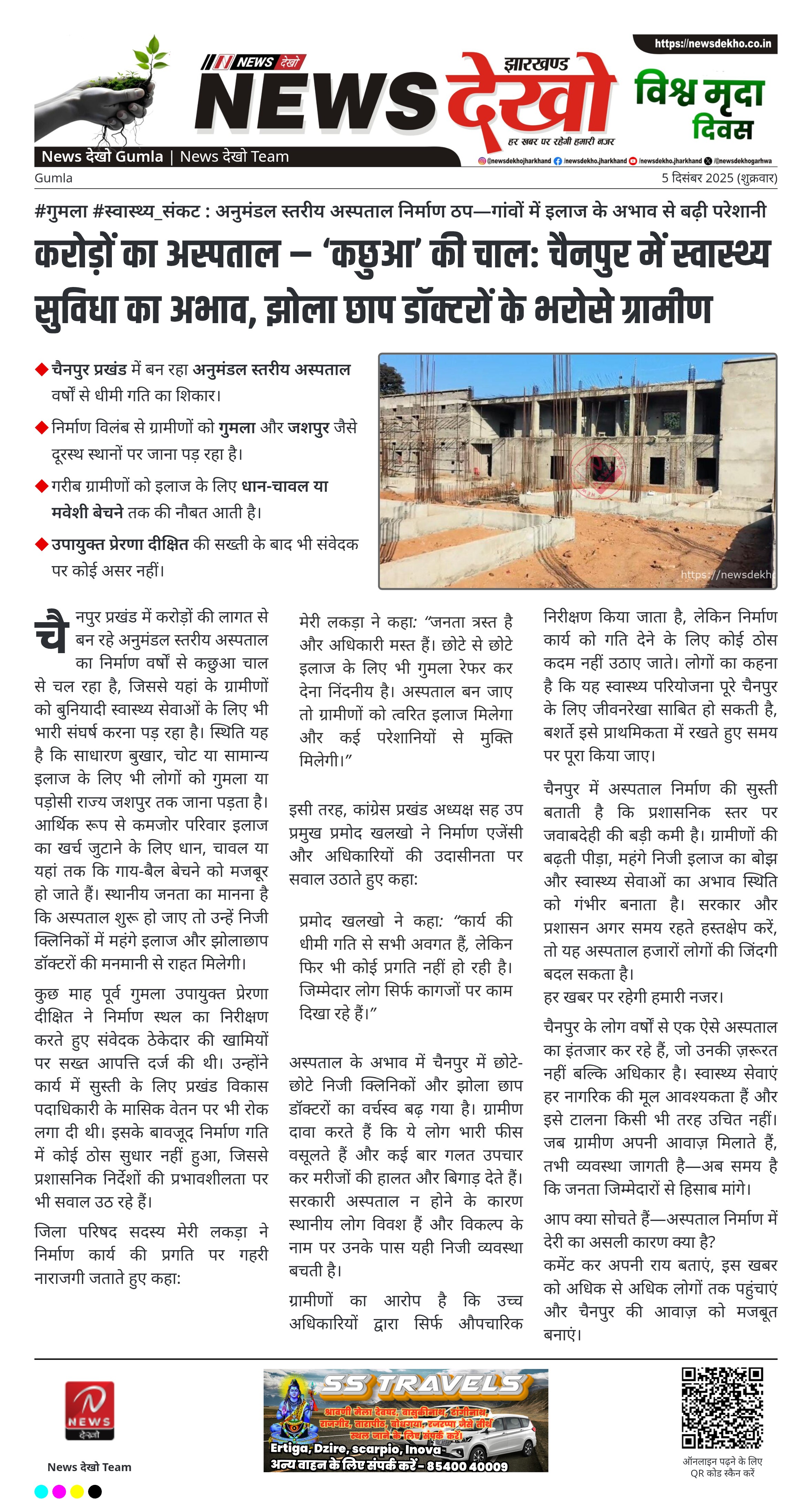 चैनपुर प्रखंड में करोड़ों की लागत से बन रहे अनुमंडल स्तरीय अस्पताल का निर्माण वर्षों से कछुआ चाल से चल रहा है, जिससे यहां के ग्रामीणों को बुनियादी स्वास्थ्य सेवाओं के लिए भी भारी संघर्ष करना पड़ रहा है। स्थिति यह है कि साधारण बुखार, चोट या सामान्य इलाज के लिए भी लोगों को गुमला या पड़ोसी राज्य जशपुर तक जाना पड़ता है। आर्थिक रूप से कमजोर परिवार इलाज का खर्च जुटाने के लिए धान, चावल या यहां तक कि गाय-बैल बेचने को मजबूर हो जाते हैं। स्थानीय जनता का मानना है कि अस्पताल शुरू हो जाए तो उन्हें निजी क्लिनिकों में महंगे इलाज और झोलाछाप डॉक्टरों की मनमानी से राहत मिलेगी।