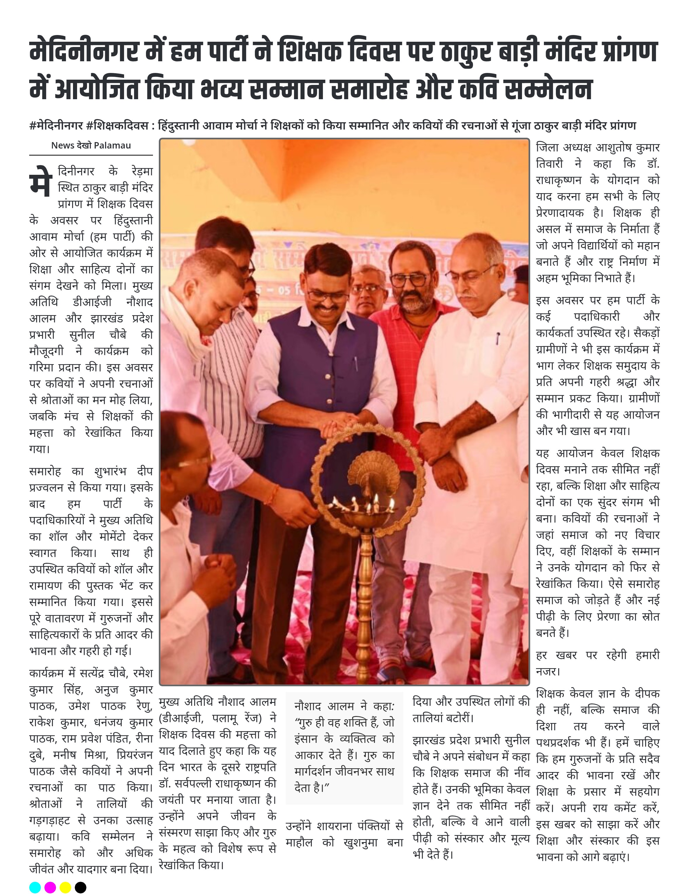 मेदिनीनगर के रेड़मा स्थित ठाकुर बाड़ी मंदिर प्रांगण में शिक्षक दिवस के अवसर पर हिंदुस्तानी आवाम मोर्चा (हम पार्टी) की ओर से आयोजित कार्यक्रम में शिक्षा और साहित्य दोनों का संगम देखने को मिला। मुख्य अतिथि डीआईजी नौशाद आलम और झारखंड प्रदेश प्रभारी सुनील चौबे की मौजूदगी ने कार्यक्रम को गरिमा प्रदान की। इस अवसर पर कवियों ने अपनी रचनाओं से श्रोताओं का मन मोह लिया, जबकि मंच से शिक्षकों की महत्ता को रेखांकित किया गया।