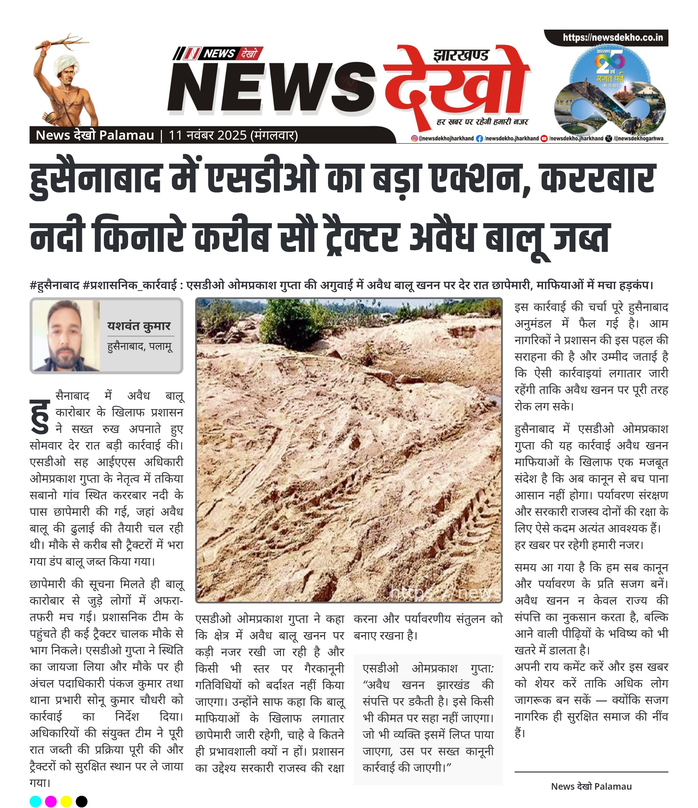हुसैनाबाद में एसडीओ ओमप्रकाश गुप्ता की यह कार्रवाई अवैध खनन माफियाओं के खिलाफ एक मजबूत संदेश है कि अब कानून से बच पाना आसान नहीं होगा। पर्यावरण संरक्षण और सरकारी राजस्व दोनों की रक्षा के लिए ऐसे कदम अत्यंत आवश्यक हैं।