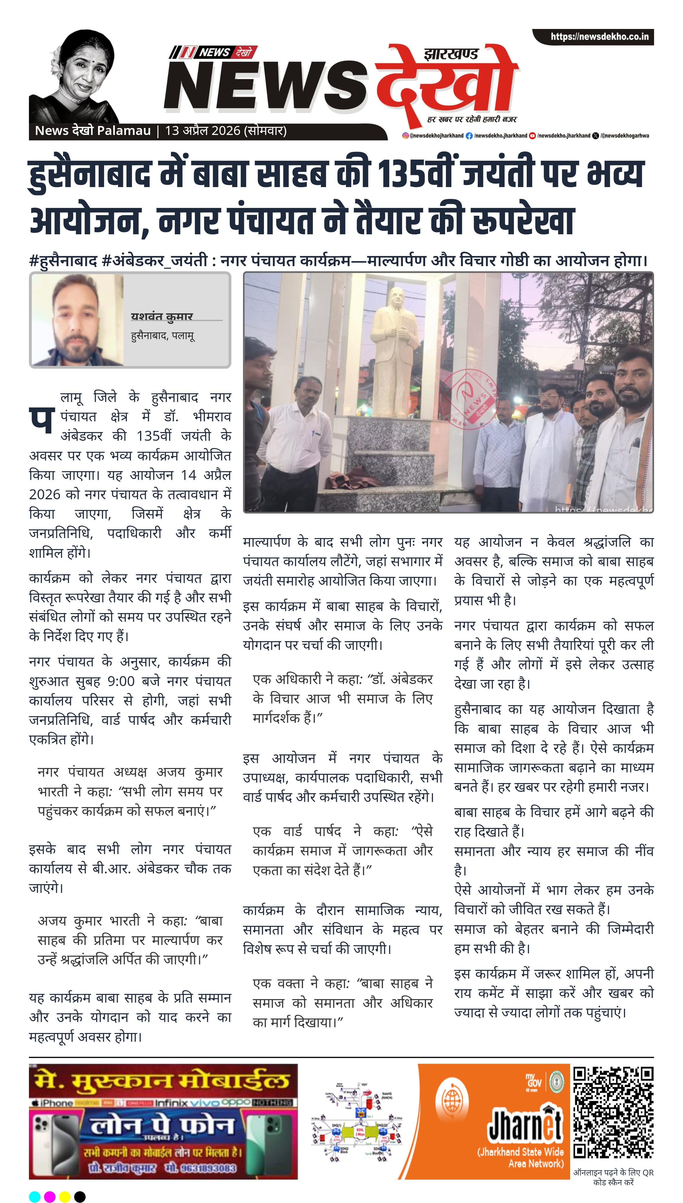 #हुसैनाबाद #अंबेडकर_जयंती : नगर पंचायत कार्यक्रम—माल्यार्पण और विचार गोष्ठी का आयोजन होगा।