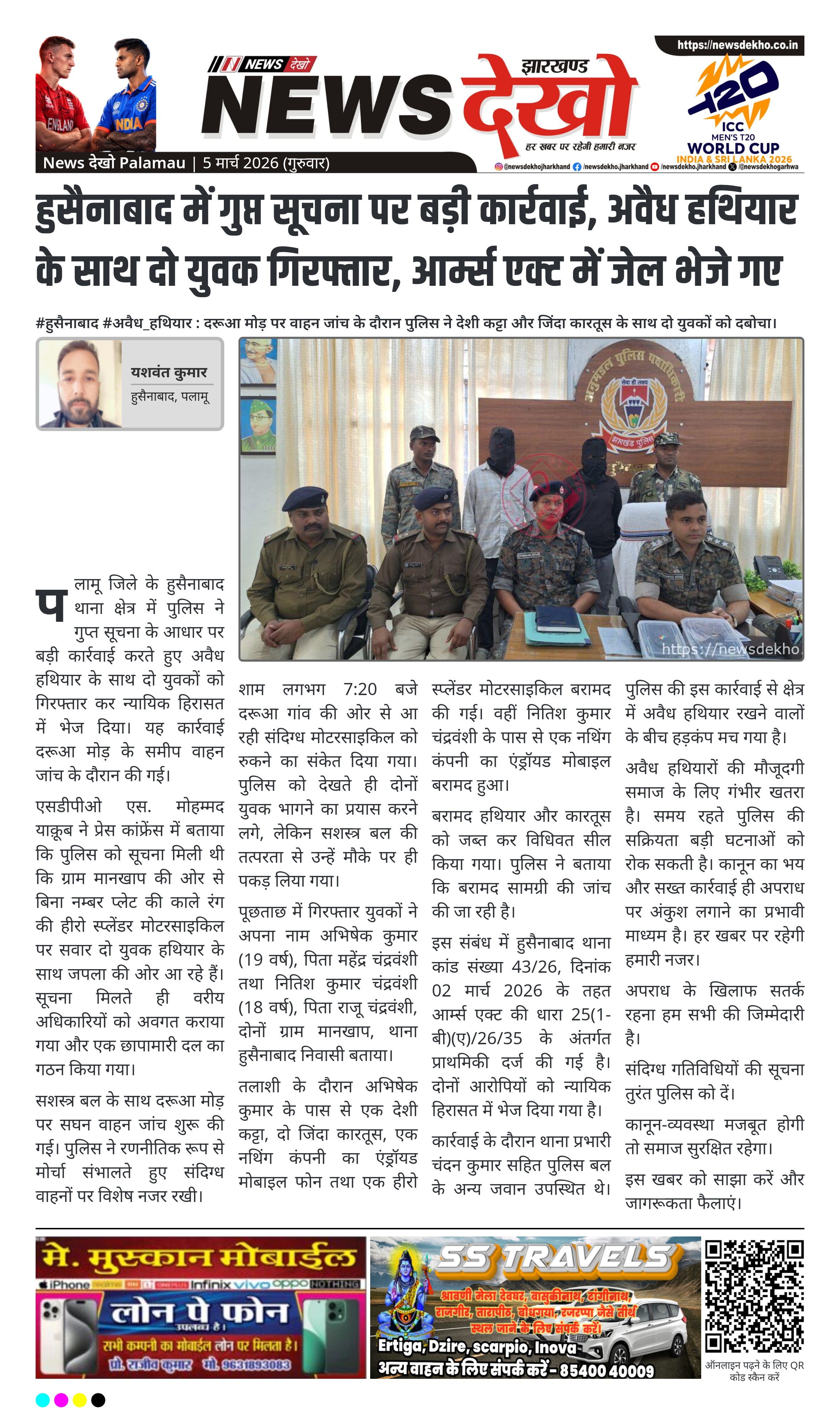 पलामू जिले के हुसैनाबाद थाना क्षेत्र में पुलिस ने गुप्त सूचना के आधार पर बड़ी कार्रवाई करते हुए अवैध हथियार के साथ दो युवकों को गिरफ्तार कर न्यायिक हिरासत में भेज दिया। यह कार्रवाई दरूआ मोड़ के समीप वाहन जांच के दौरान की गई।