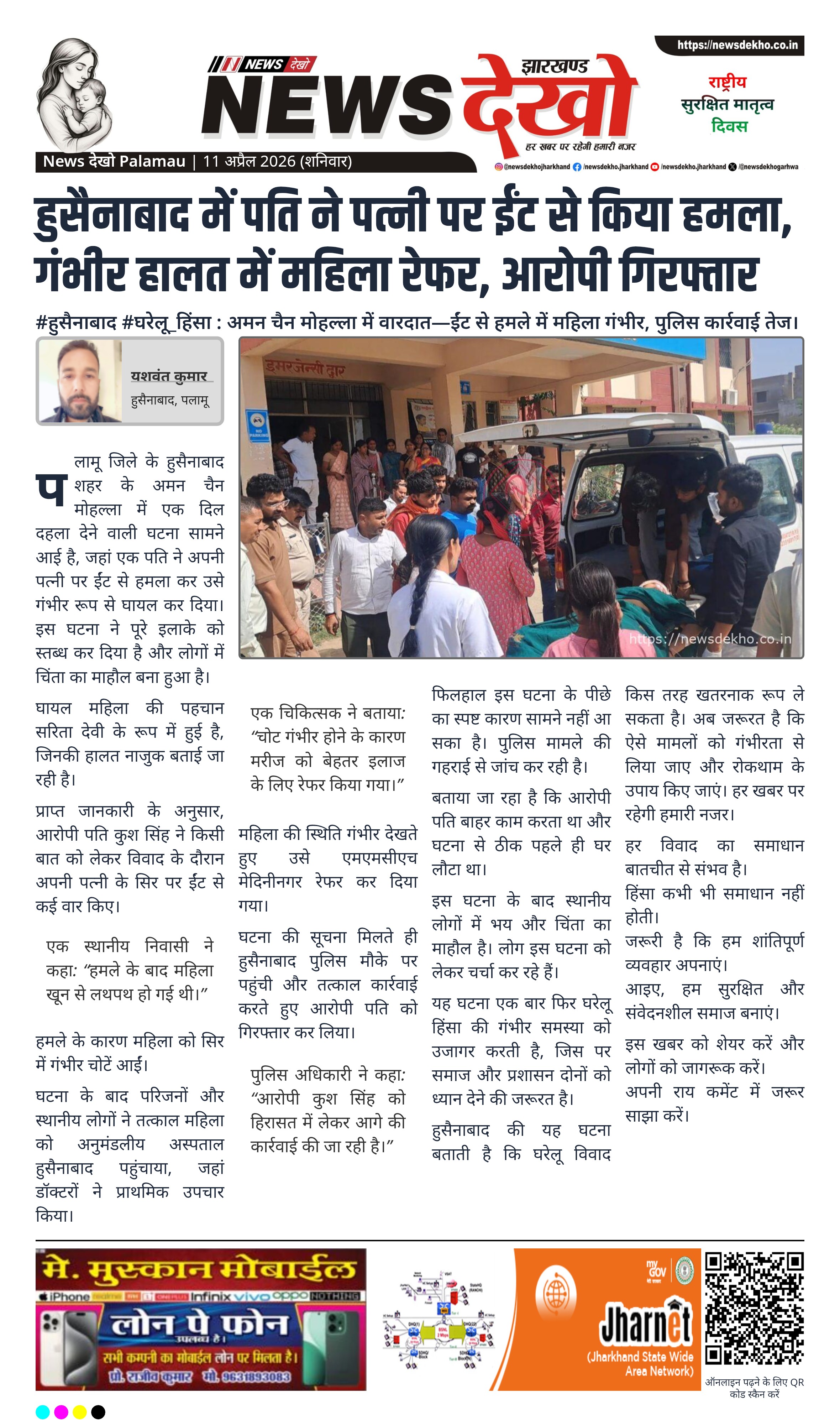 पलामू जिले के हुसैनाबाद शहर के अमन चैन मोहल्ला में एक दिल दहला देने वाली घटना सामने आई है, जहां एक पति ने अपनी पत्नी पर ईंट से हमला कर उसे गंभीर रूप से घायल कर दिया। इस घटना ने पूरे इलाके को स्तब्ध कर दिया है और लोगों में चिंता का माहौल बना हुआ है।