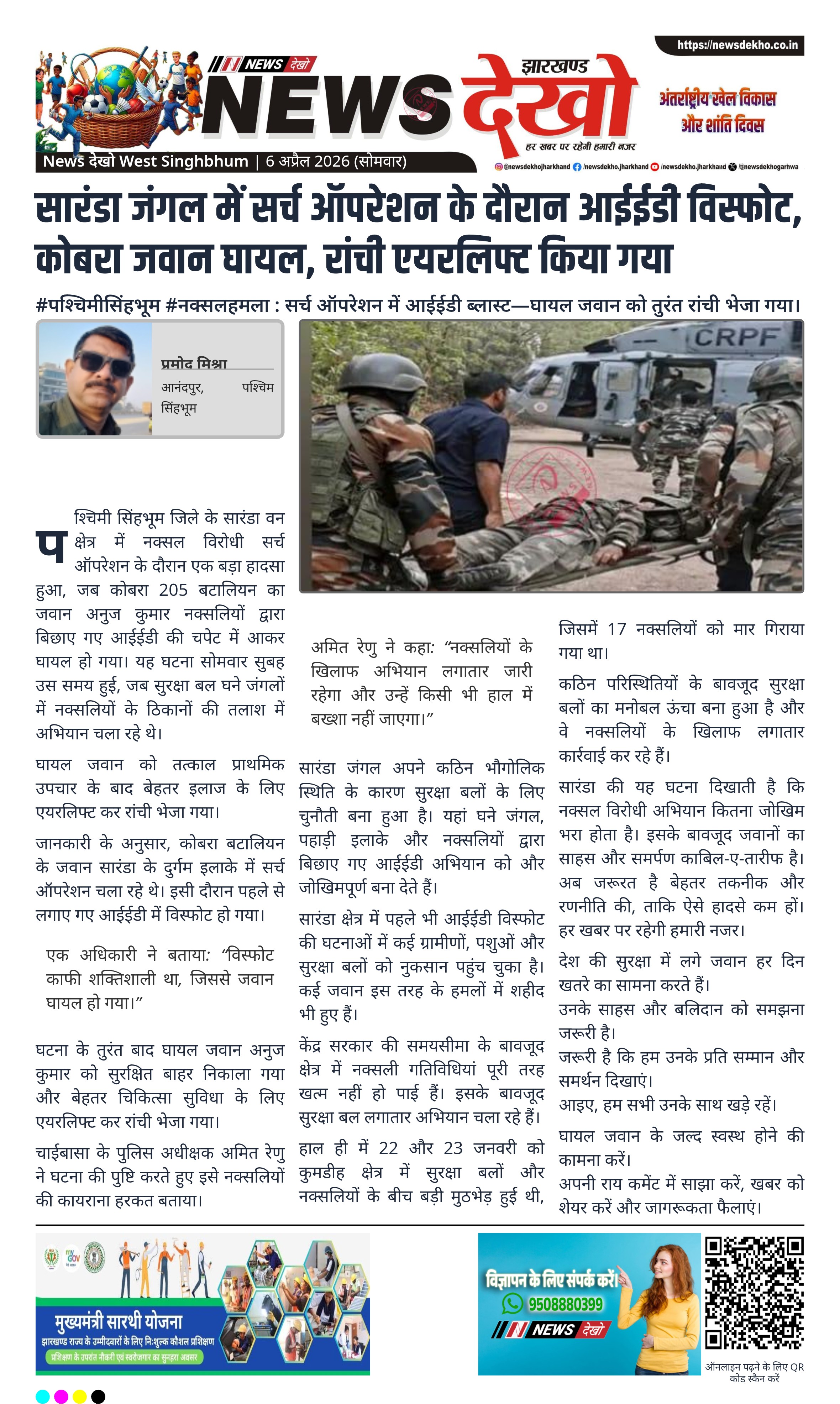 जानकारी के अनुसार, कोबरा बटालियन के जवान सारंडा के दुर्गम इलाके में सर्च ऑपरेशन चला रहे थे। इसी दौरान पहले से लगाए गए आईईडी में विस्फोट हो गया।