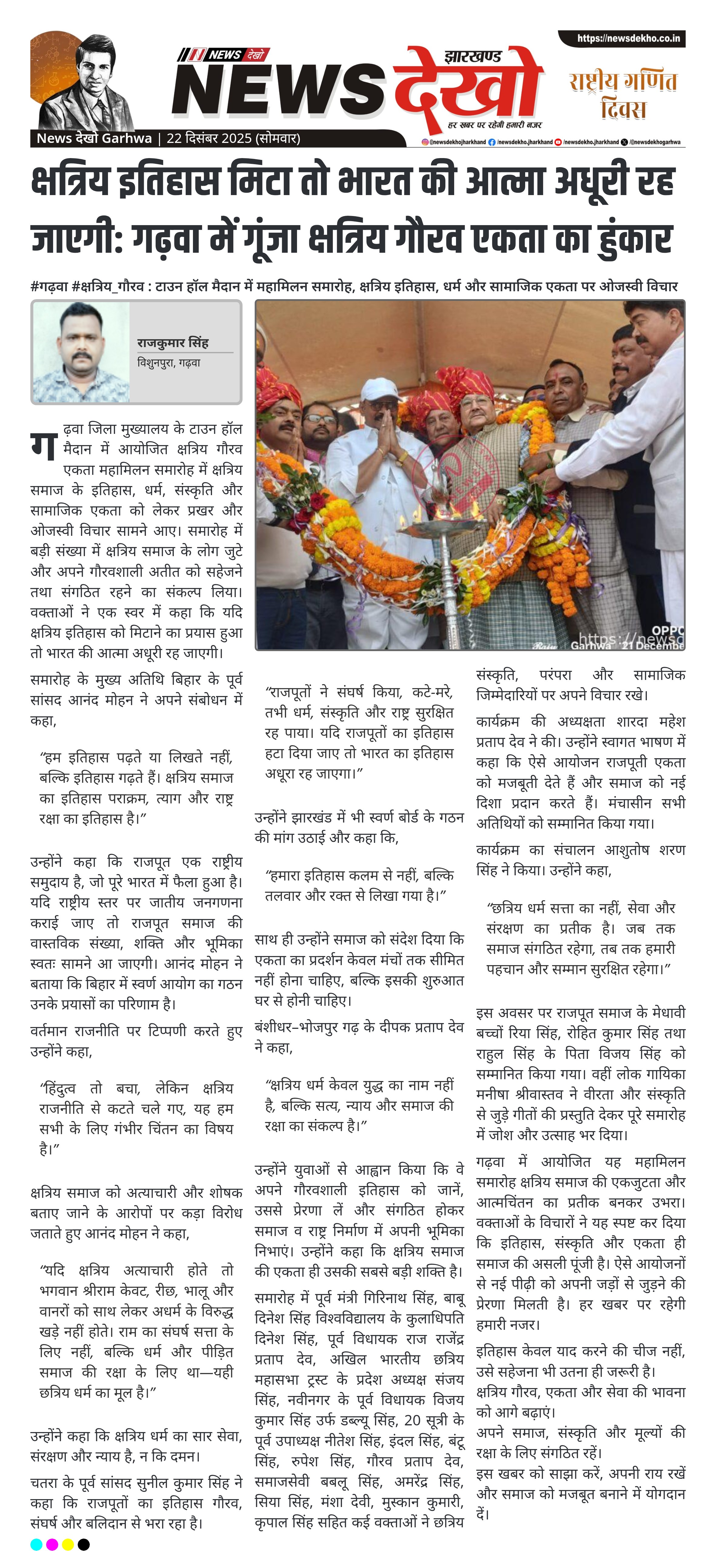 गढ़वा जिला मुख्यालय के टाउन हॉल मैदान में आयोजित क्षत्रिय गौरव एकता महामिलन समारोह में क्षत्रिय समाज के इतिहास, धर्म, संस्कृति और सामाजिक एकता को लेकर प्रखर और ओजस्वी विचार सामने आए। समारोह में बड़ी संख्या में क्षत्रिय समाज के लोग जुटे और अपने गौरवशाली अतीत को सहेजने तथा संगठित रहने का संकल्प लिया। वक्ताओं ने एक स्वर में कहा कि यदि क्षत्रिय इतिहास को मिटाने का प्रयास हुआ तो भारत की आत्मा अधूरी रह जाएगी।