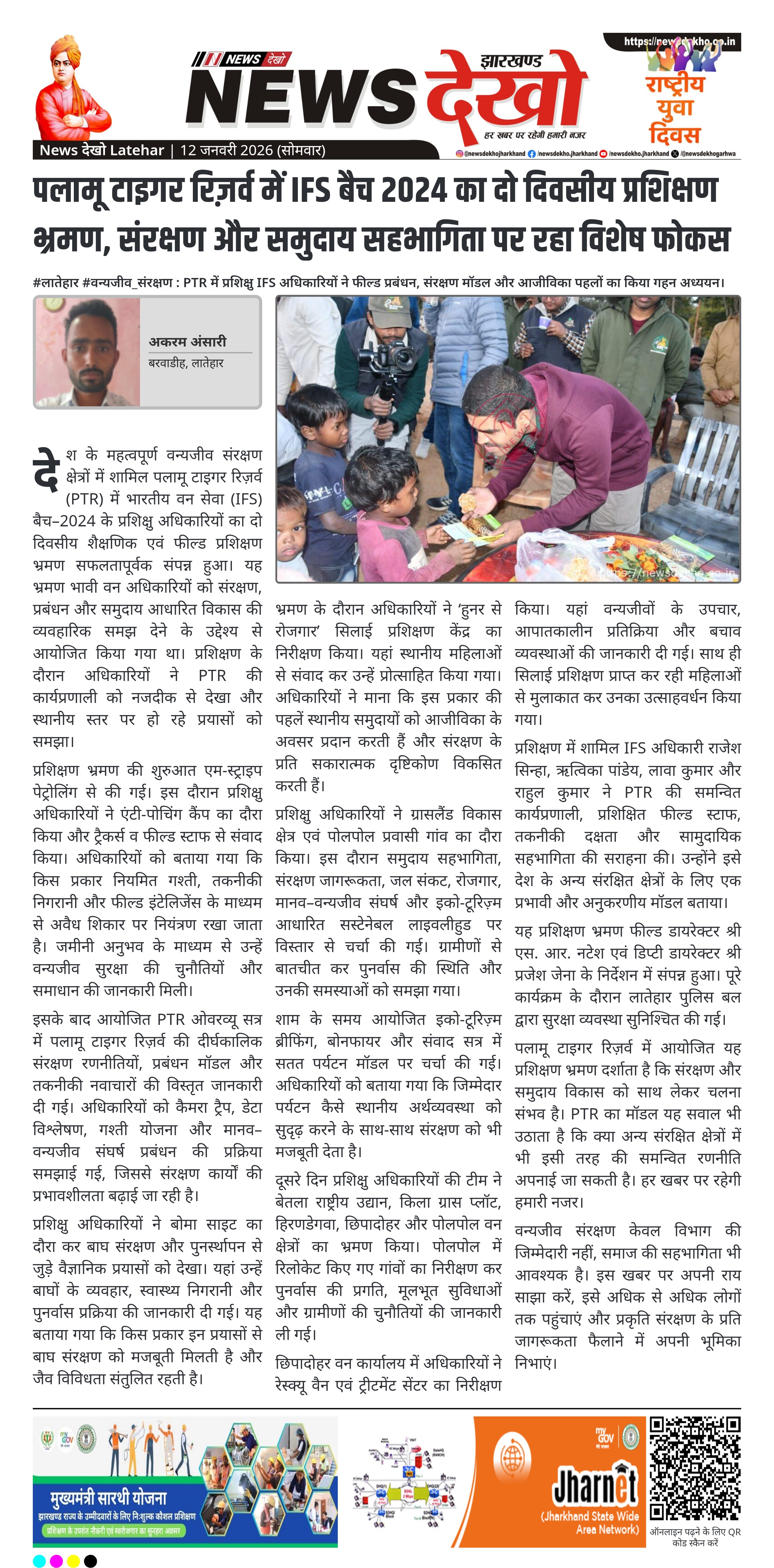 देश के महत्वपूर्ण वन्यजीव संरक्षण क्षेत्रों में शामिल पलामू टाइगर रिज़र्व (PTR) में भारतीय वन सेवा (IFS) बैच–2024 के प्रशिक्षु अधिकारियों का दो दिवसीय शैक्षणिक एवं फील्ड प्रशिक्षण भ्रमण सफलतापूर्वक संपन्न हुआ। यह भ्रमण भावी वन अधिकारियों को संरक्षण, प्रबंधन और समुदाय आधारित विकास की व्यवहारिक समझ देने के उद्देश्य से आयोजित किया गया था। प्रशिक्षण के दौरान अधिकारियों ने PTR की कार्यप्रणाली को नजदीक से देखा और स्थानीय स्तर पर हो रहे प्रयासों को समझा।