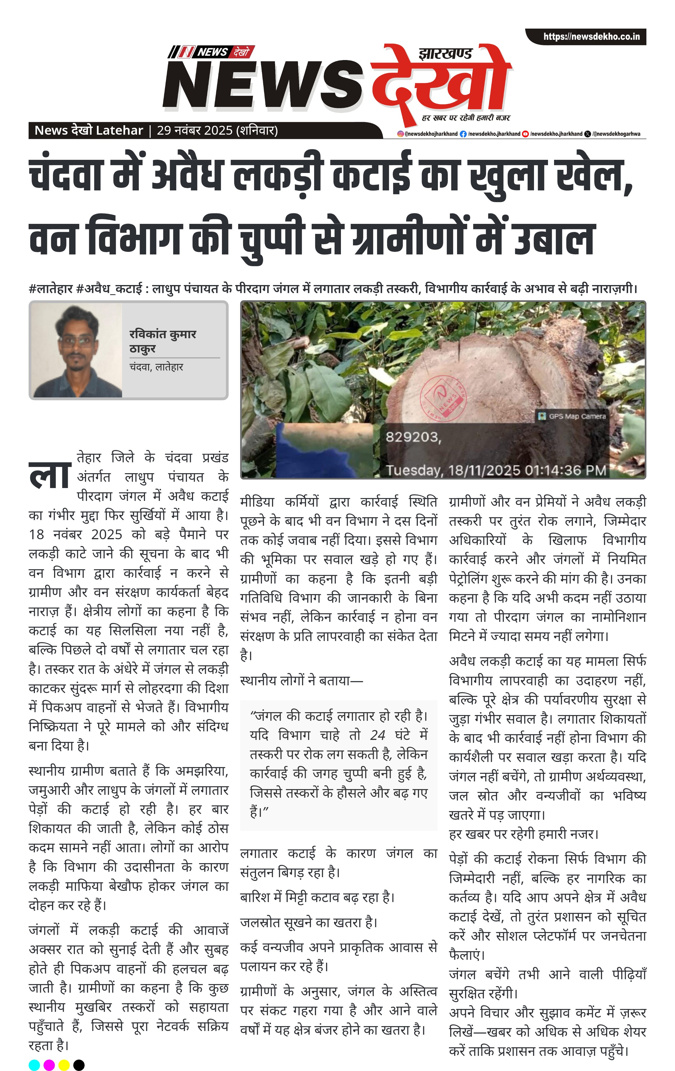 लातेहार जिले के चंदवा प्रखंड अंतर्गत लाधुप पंचायत के पीरदाग जंगल में अवैध कटाई का गंभीर मुद्दा फिर सुर्खियों में आया है। 18 नवंबर 2025 को बड़े पैमाने पर लकड़ी काटे जाने की सूचना के बाद भी वन विभाग द्वारा कार्रवाई न करने से ग्रामीण और वन संरक्षण कार्यकर्ता बेहद नाराज़ हैं। क्षेत्रीय लोगों का कहना है कि कटाई का यह सिलसिला नया नहीं है, बल्कि पिछले दो वर्षों से लगातार चल रहा है। तस्कर रात के अंधेरे में जंगल से लकड़ी काटकर सुंदरू मार्ग से लोहरदगा की दिशा में पिकअप वाहनों से भेजते हैं। विभागीय निष्क्रियता ने पूरे मामले को और संदिग्ध बना दिया है।