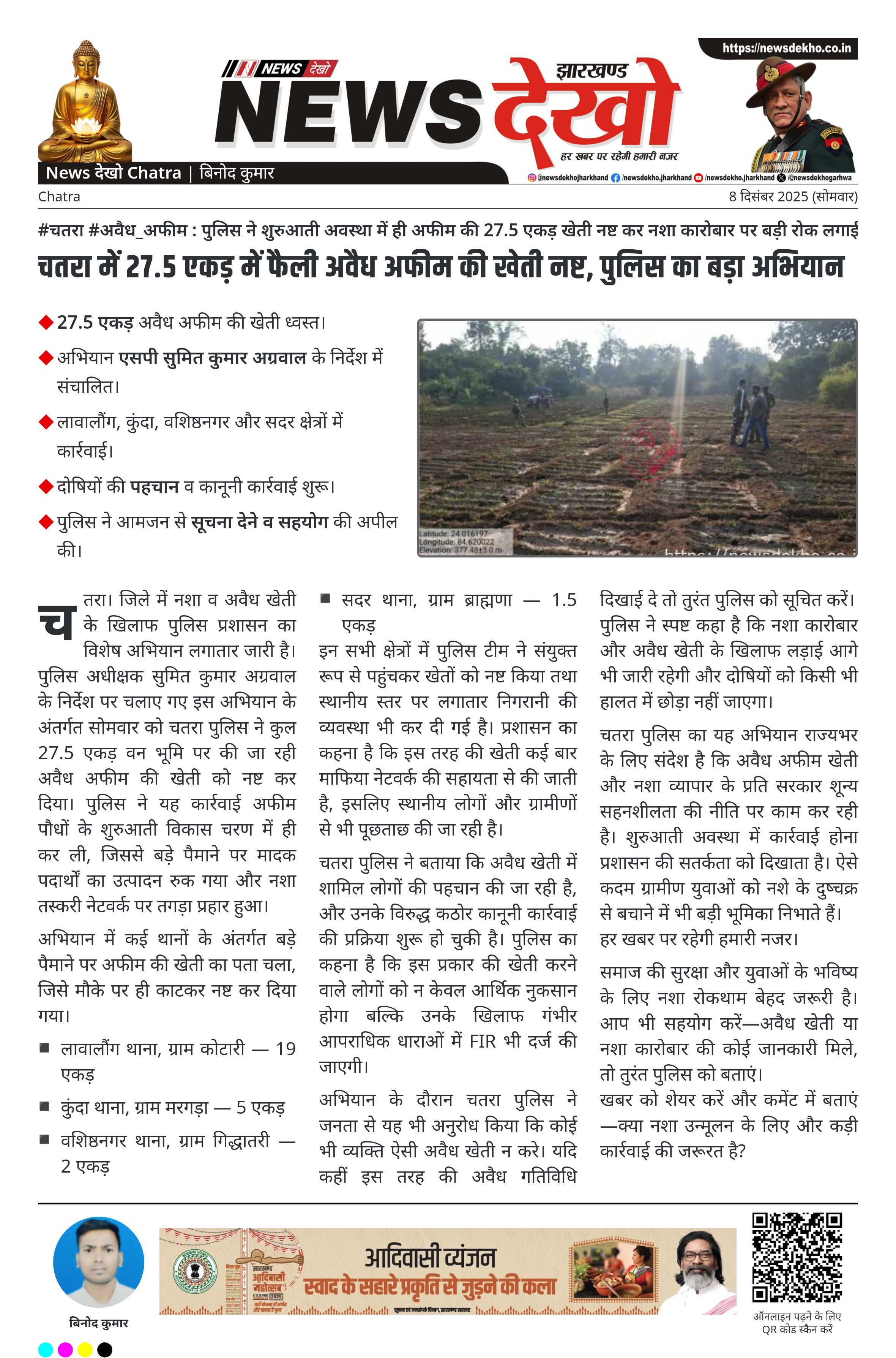 चतरा पुलिस का यह अभियान राज्यभर के लिए संदेश है कि अवैध अफीम खेती और नशा व्यापार के प्रति सरकार शून्य सहनशीलता की नीति पर काम कर रही है। शुरुआती अवस्था में कार्रवाई होना प्रशासन की सतर्कता को दिखाता है। ऐसे कदम ग्रामीण युवाओं को नशे के दुष्चक्र से बचाने में भी बड़ी भूमिका निभाते हैं।