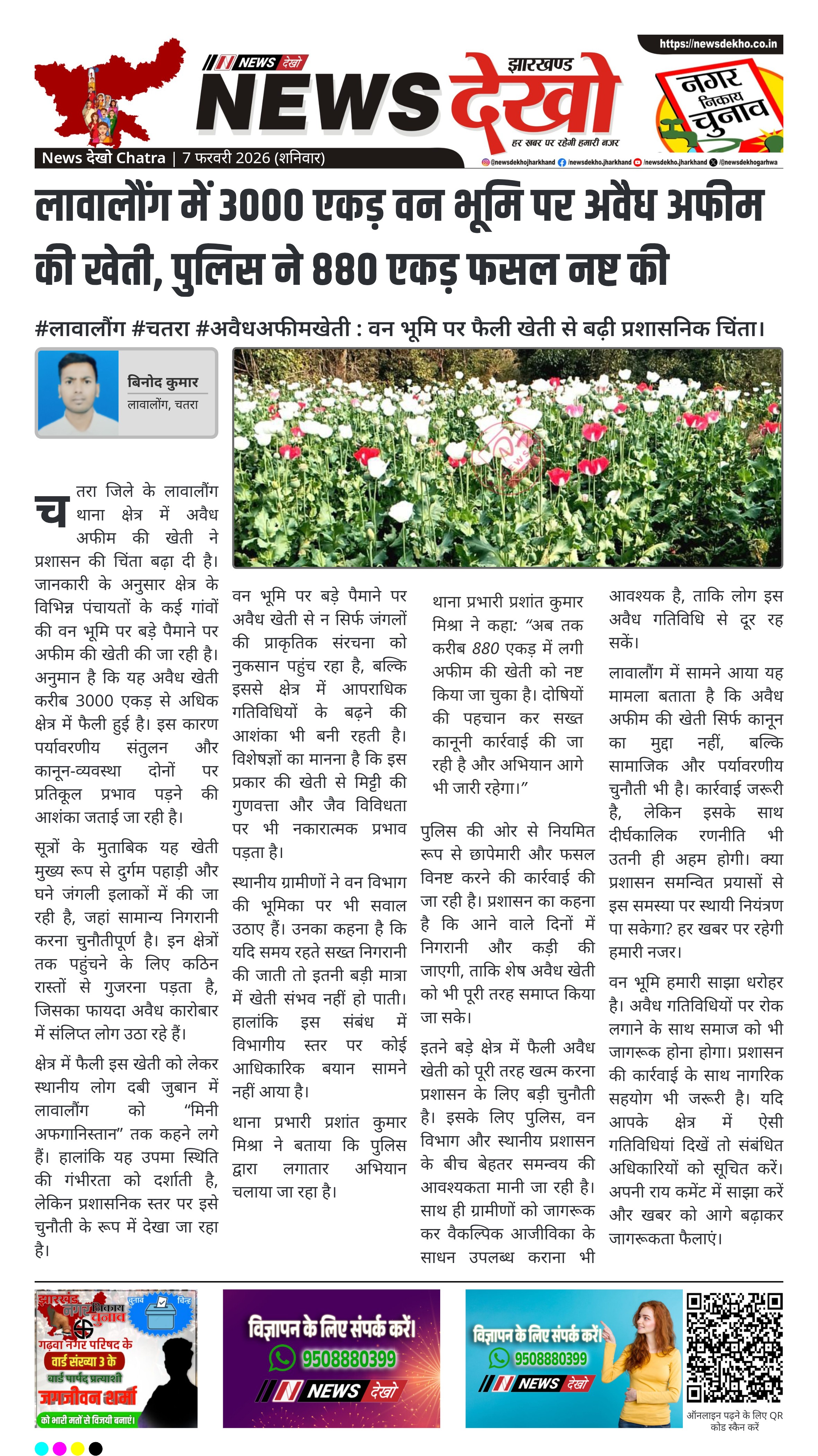 चतरा जिले के लावालौंग थाना क्षेत्र में बड़े पैमाने पर अवैध अफीम की खेती सामने आई है। अनुमान है कि करीब 3000 एकड़ से अधिक वन भूमि पर यह खेती फैली हुई है। पुलिस ने अब तक 880 एकड़ में लगी फसल को नष्ट करने की कार्रवाई की है। मामले ने पर्यावरण और कानून व्यवस्था को लेकर गंभीर सवाल खड़े कर दिए हैं।