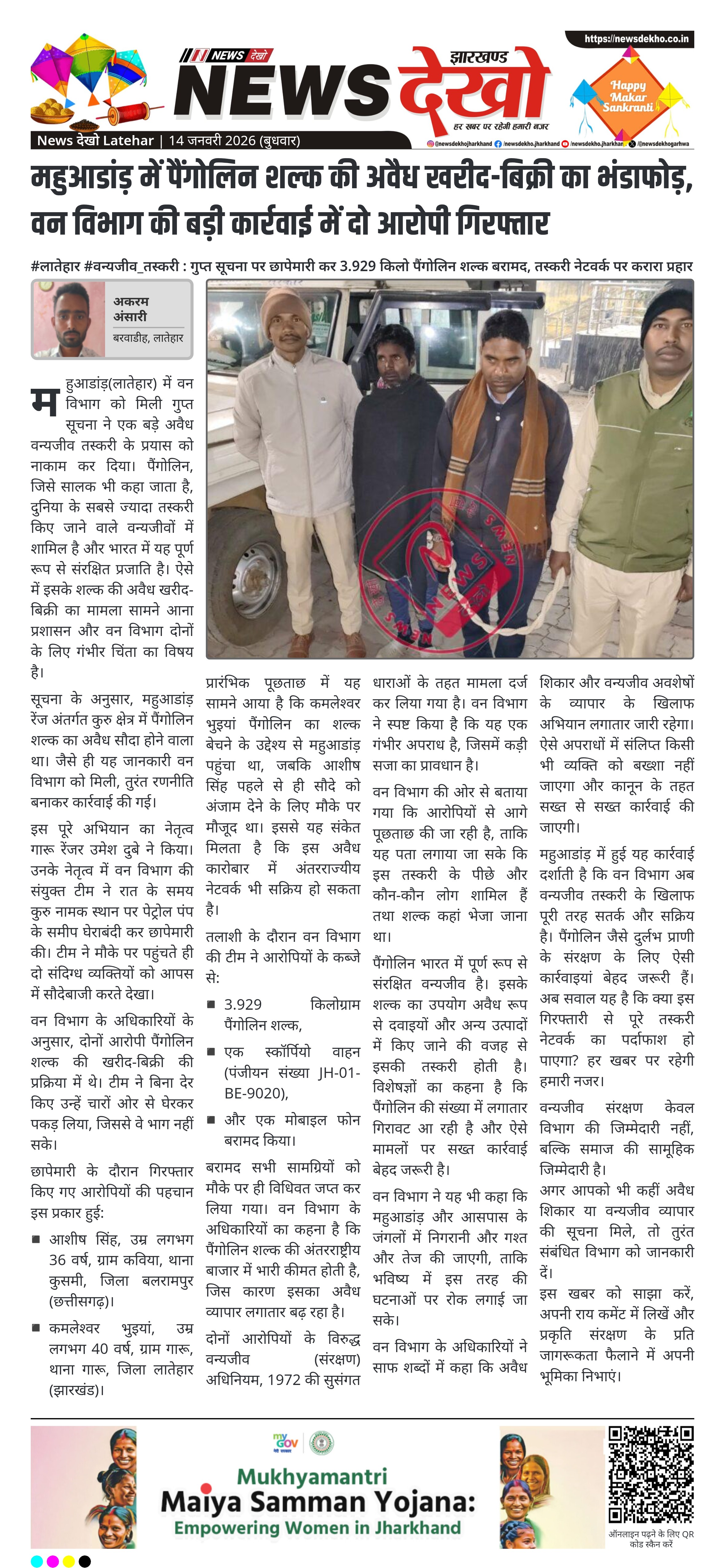 लातेहार जिले के महुआडांड़ क्षेत्र में वन विभाग ने दुर्लभ वन्यजीव पैंगोलिन के शल्क की अवैध खरीद-बिक्री का पर्दाफाश किया है। 12 जनवरी 2026 की रात गुप्त सूचना के आधार पर की गई छापेमारी में दो आरोपियों को रंगे हाथों गिरफ्तार किया गया। कार्रवाई के दौरान 3.929 किलोग्राम पैंगोलिन शल्क, एक स्कॉर्पियो वाहन और मोबाइल फोन जब्त किया गया। यह मामला वन्यजीव संरक्षण की दृष्टि से अत्यंत महत्वपूर्ण माना जा रहा है।