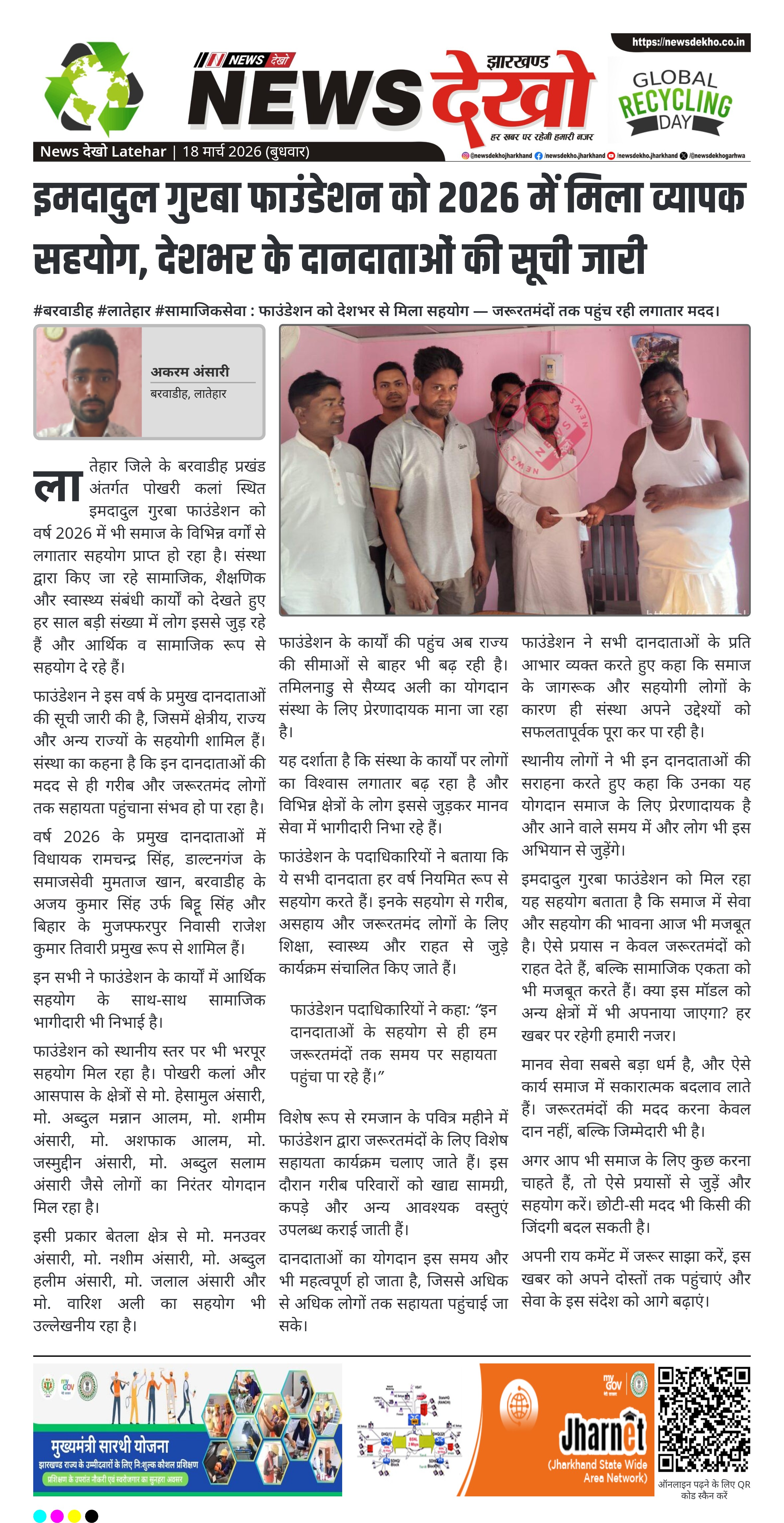 लातेहार जिले के बरवाडीह प्रखंड अंतर्गत पोखरी कलां स्थित इमदादुल गुरबा फाउंडेशन को वर्ष 2026 में भी समाज के विभिन्न वर्गों से लगातार सहयोग प्राप्त हो रहा है। संस्था द्वारा किए जा रहे सामाजिक, शैक्षणिक और स्वास्थ्य संबंधी कार्यों को देखते हुए हर साल बड़ी संख्या में लोग इससे जुड़ रहे हैं और आर्थिक व सामाजिक रूप से सहयोग दे रहे हैं।