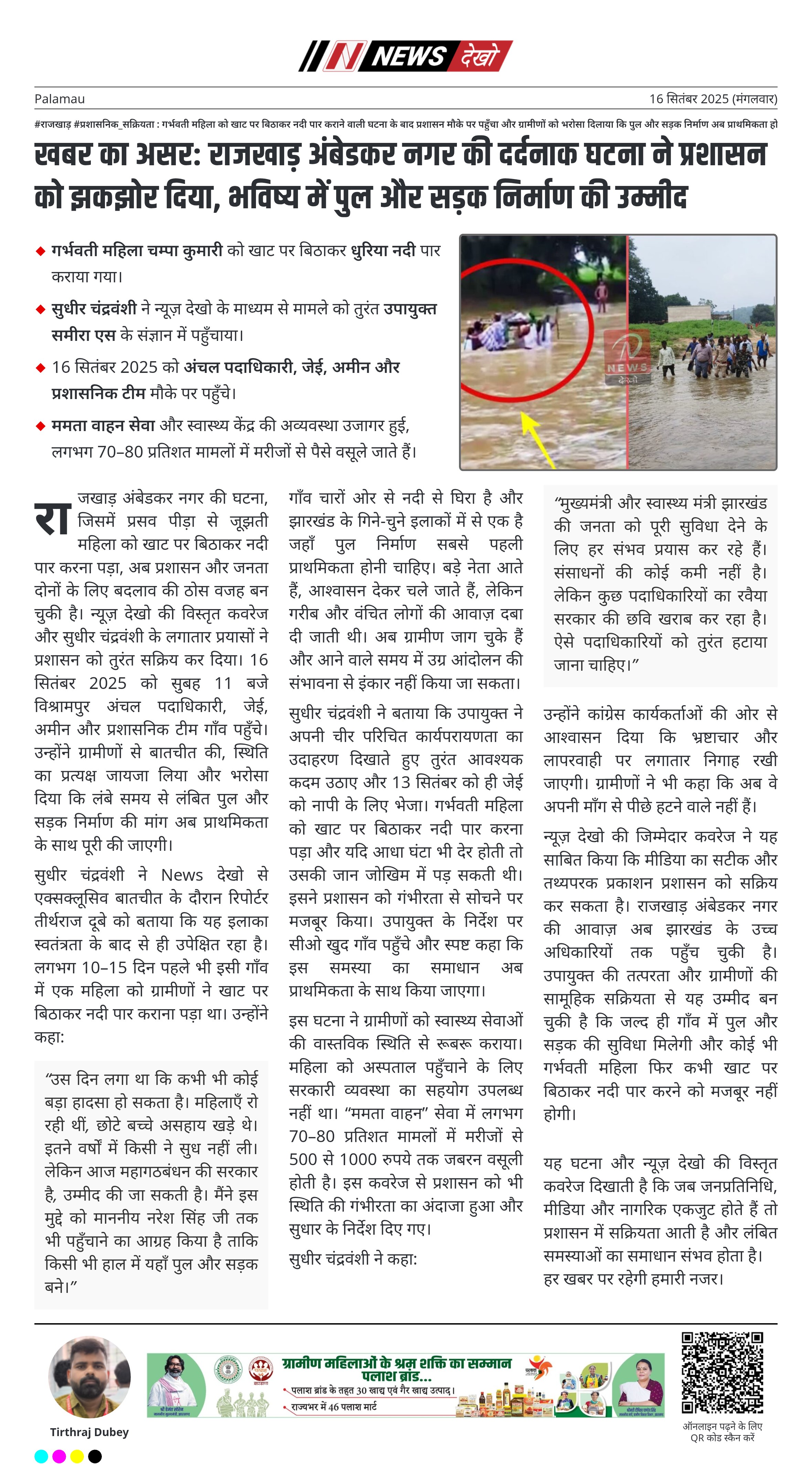 न्यूज़ देखो की जिम्मेदार कवरेज ने यह साबित किया कि मीडिया का सटीक और तथ्यपरक प्रकाशन प्रशासन को सक्रिय कर सकता है। राजखाड़ अंबेडकर नगर की आवाज़ अब झारखंड के उच्च अधिकारियों तक पहुँच चुकी है। उपायुक्त की तत्परता और ग्रामीणों की सामूहिक सक्रियता से यह उम्मीद बन चुकी है कि जल्द ही गाँव में पुल और सड़क की सुविधा मिलेगी और कोई भी गर्भवती महिला फिर कभी खाट पर बिठाकर नदी पार करने को मजबूर नहीं होगी।