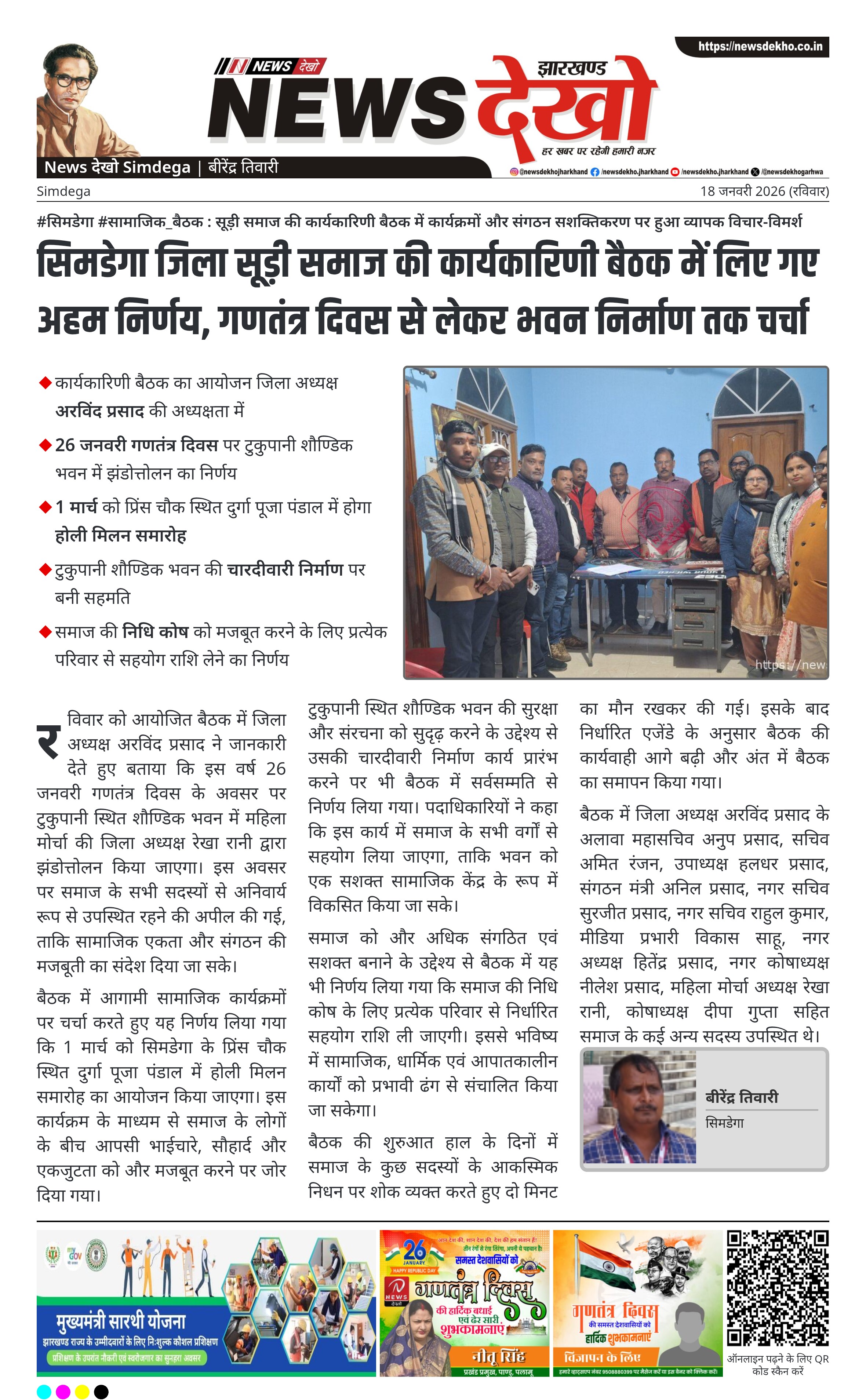 सिमडेगा जिला सूड़ी समाज की कार्यकारिणी बैठक में लिए गए अहम निर्णय, गणतंत्र दिवस से लेकर भवन निर्माण तक चर्चा