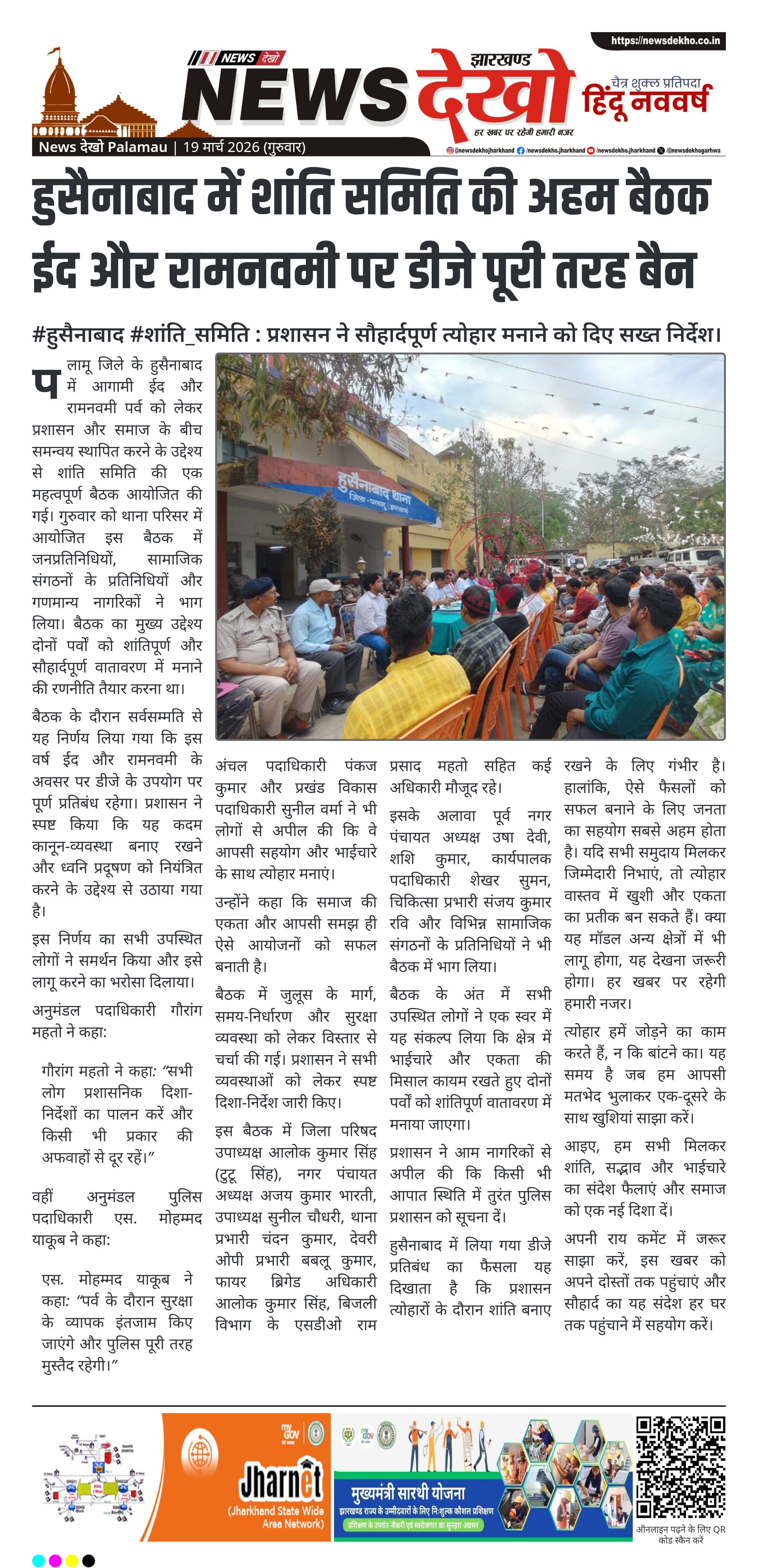 पलामू के हुसैनाबाद में ईद और रामनवमी को लेकर शांति समिति की बैठक आयोजित की गई। बैठक में प्रशासन ने कानून-व्यवस्था बनाए रखने के लिए डीजे पर पूर्ण प्रतिबंध लगाने का निर्णय लिया। अधिकारियों ने सभी समुदायों से आपसी भाईचारे के साथ पर्व मनाने की अपील की। सुरक्षा व्यवस्था और जुलूस के मार्ग को लेकर भी विस्तृत चर्चा की गई।