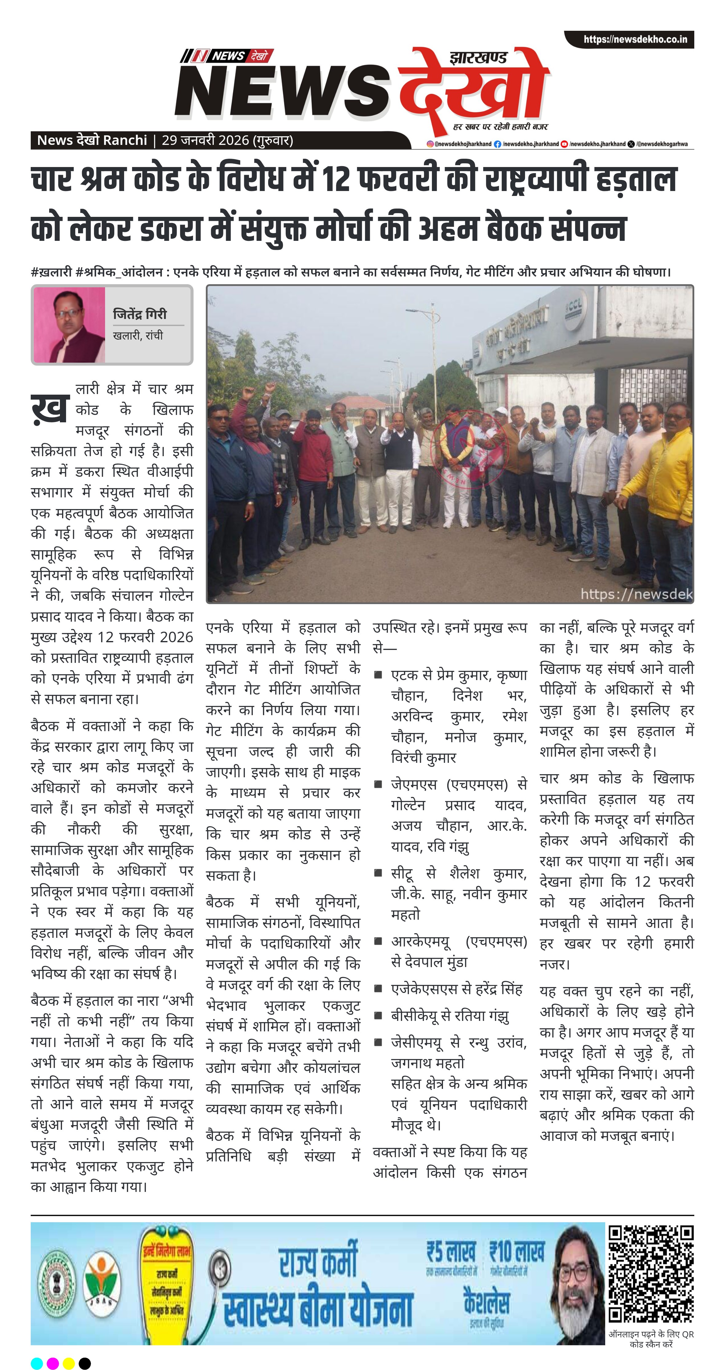 ख़लारी के डकरा स्थित वीआईपी सभागार में चार श्रम कोड के विरोध में 12 फरवरी 2026 को होने वाली राष्ट्रव्यापी हड़ताल को लेकर संयुक्त मोर्चा की बैठक आयोजित की गई। बैठक में एनके एरिया में हड़ताल को पूरी मजबूती से सफल बनाने का सर्वसम्मत निर्णय लिया गया। श्रमिक संगठनों ने इसे मजदूरों के जीवन-मरण का सवाल बताया। बैठक में हड़ताल की रणनीति, प्रचार और एकजुट संघर्ष पर विशेष जोर दिया गया।