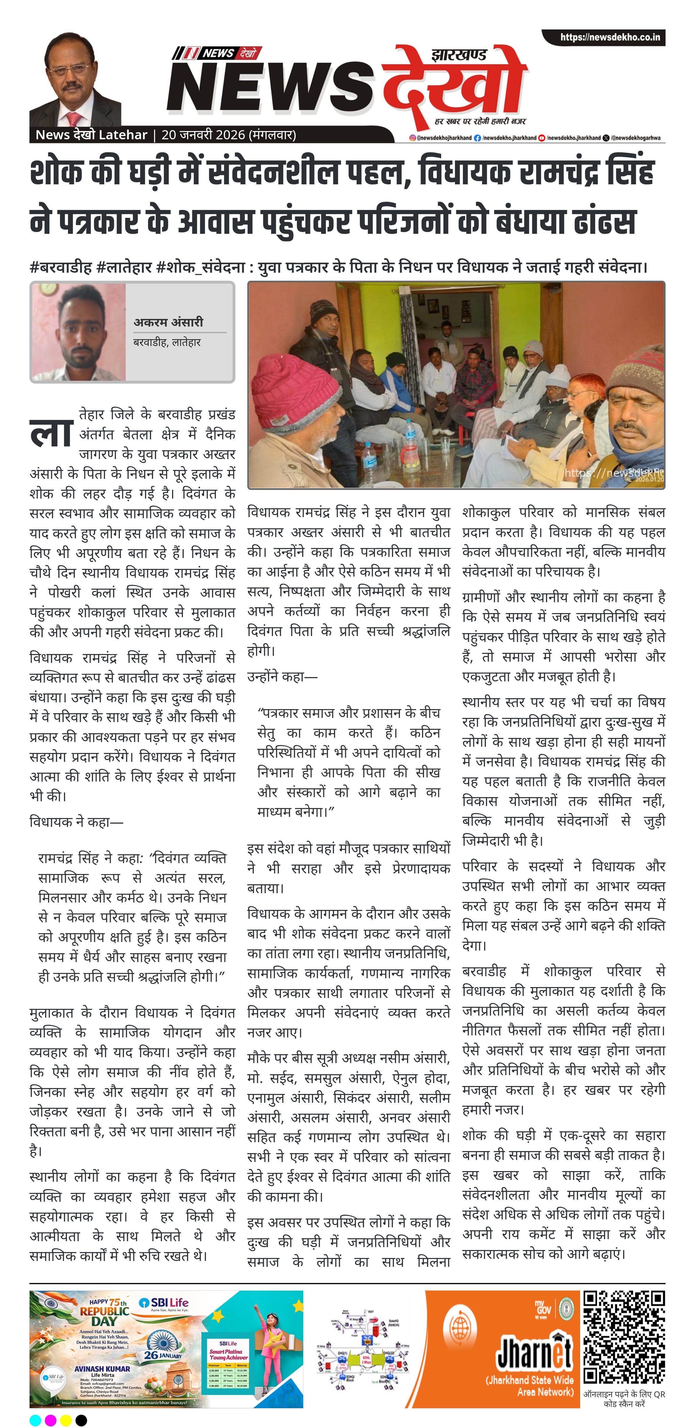 लातेहार जिले के बरवाडीह प्रखंड में एक युवा पत्रकार के पिता के निधन से क्षेत्र में शोक का माहौल है। दैनिक जागरण के बेतला क्षेत्र के पत्रकार अख्तर अंसारी के पिता के निधन के चौथे दिन स्थानीय विधायक रामचंद्र सिंह ने उनके आवास पहुंचकर शोकाकुल परिवार से मुलाकात की। विधायक ने परिजनों को ढांढस बंधाया और दिवंगत आत्मा की शांति के लिए प्रार्थना की, जिससे सामाजिक संवेदनशीलता और मानवीय सरोकार का संदेश गया।