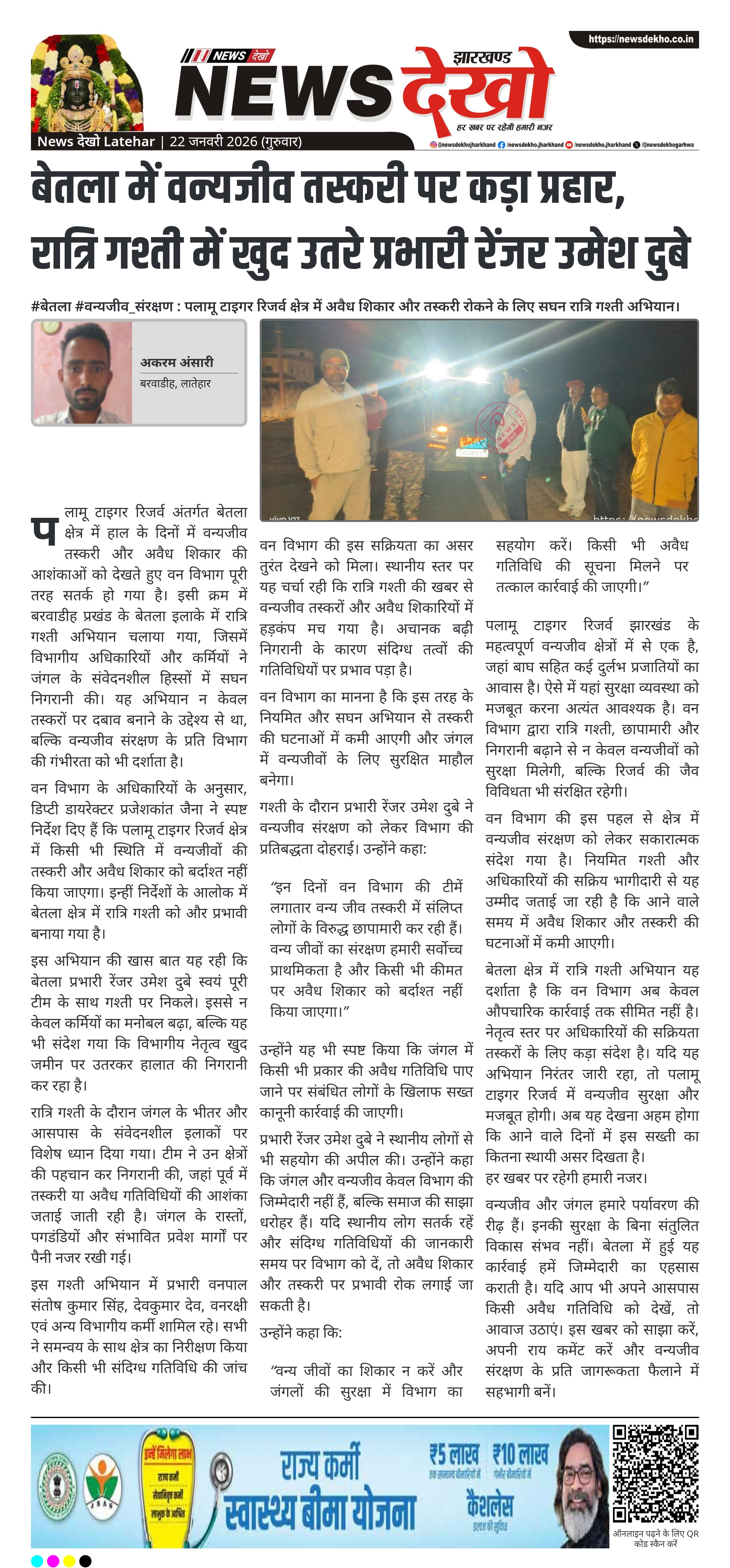 - पलामू टाइगर रिजर्व क्षेत्र में रात्रि गश्ती अभियान तेज।