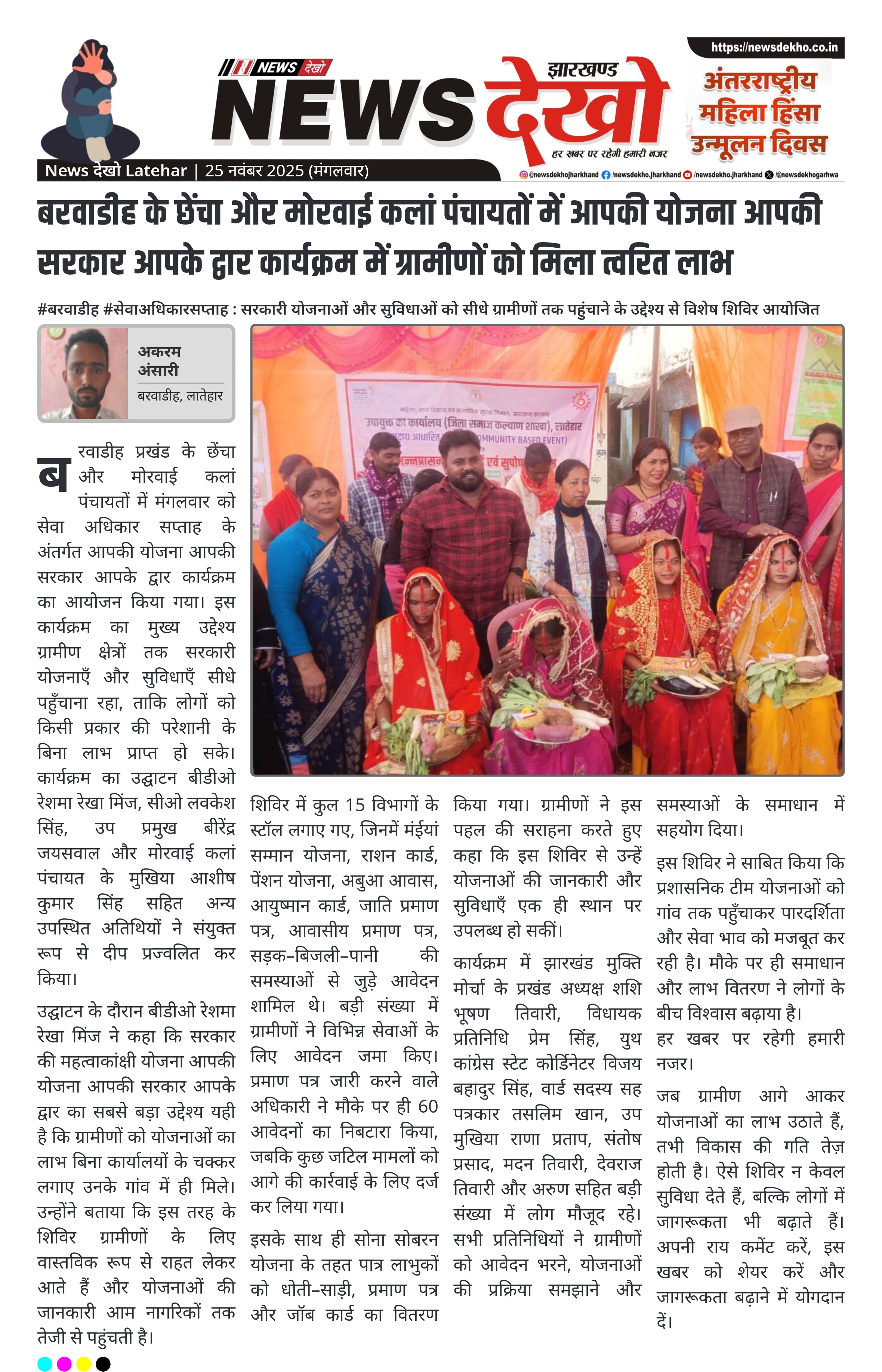 बरवाडीह प्रखंड के छेंचा और मोरवाई कलां पंचायतों में मंगलवार को सेवा अधिकार सप्ताह के अंतर्गत आपकी योजना आपकी सरकार आपके द्वार कार्यक्रम का आयोजन किया गया। इस कार्यक्रम का मुख्य उद्देश्य ग्रामीण क्षेत्रों तक सरकारी योजनाएँ और सुविधाएँ सीधे पहुँचाना रहा, ताकि लोगों को किसी प्रकार की परेशानी के बिना लाभ प्राप्त हो सके। कार्यक्रम का उद्घाटन बीडीओ रेशमा रेखा मिंज, सीओ लवकेश सिंह, उप प्रमुख बीरेंद्र जयसवाल और मोरवाई कलां पंचायत के मुखिया आशीष कुमार सिंह सहित अन्य उपस्थित अतिथियों ने संयुक्त रूप से दीप प्रज्वलित कर किया।