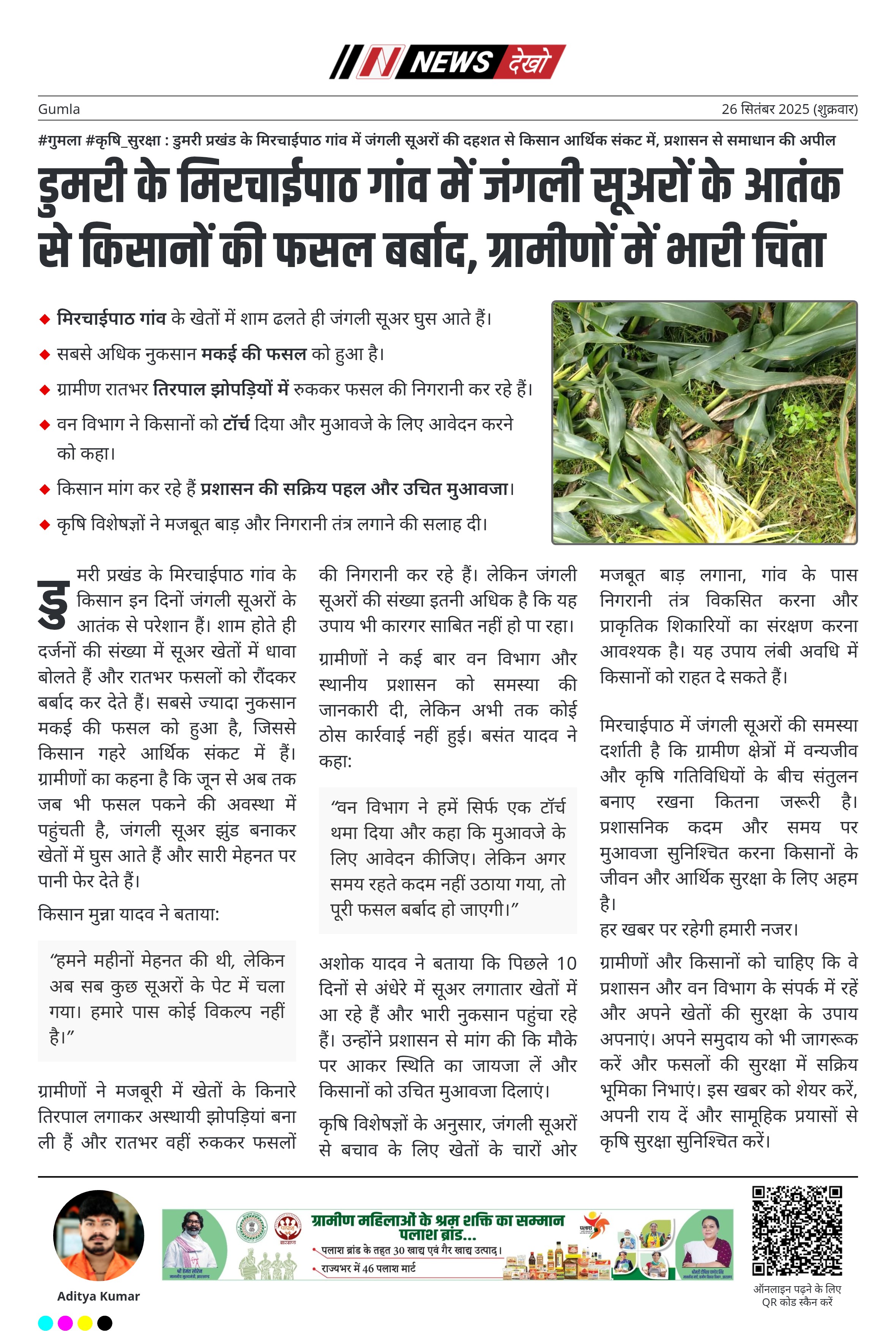 #गुमला #कृषि_सुरक्षा : डुमरी प्रखंड के मिरचाईपाठ गांव में जंगली सूअरों की दहशत से किसान आर्थिक संकट में, प्रशासन से समाधान की अपील