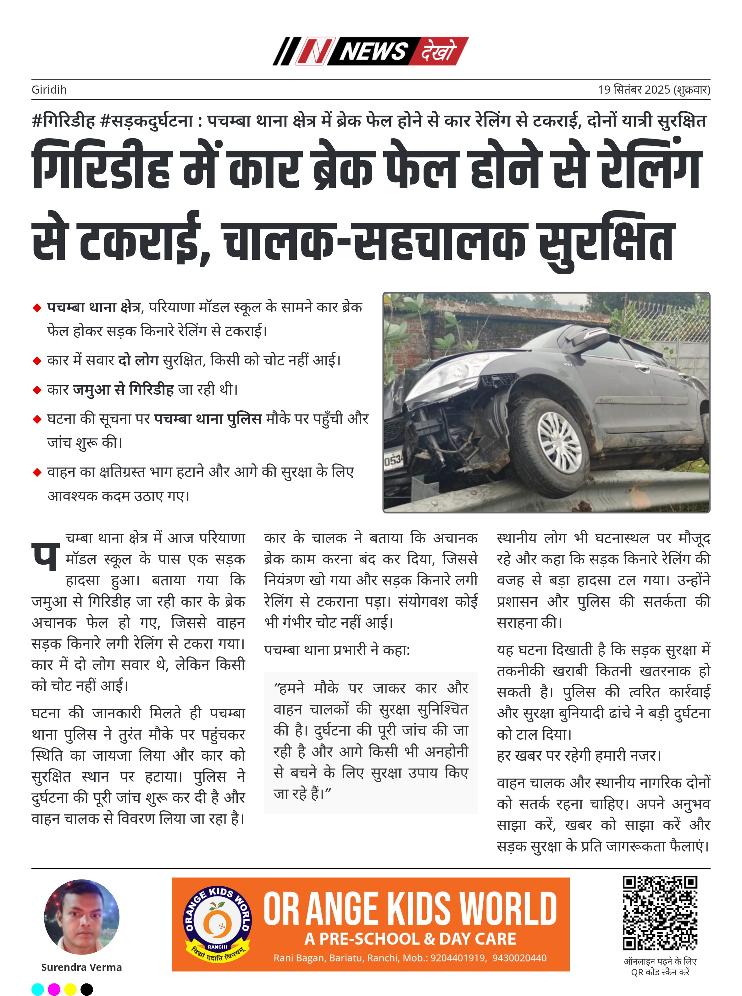 #गिरिडीह #सड़कदुर्घटना : पचम्बा थाना क्षेत्र में ब्रेक फेल होने से कार रेलिंग से टकराई, दोनों यात्री सुरक्षित