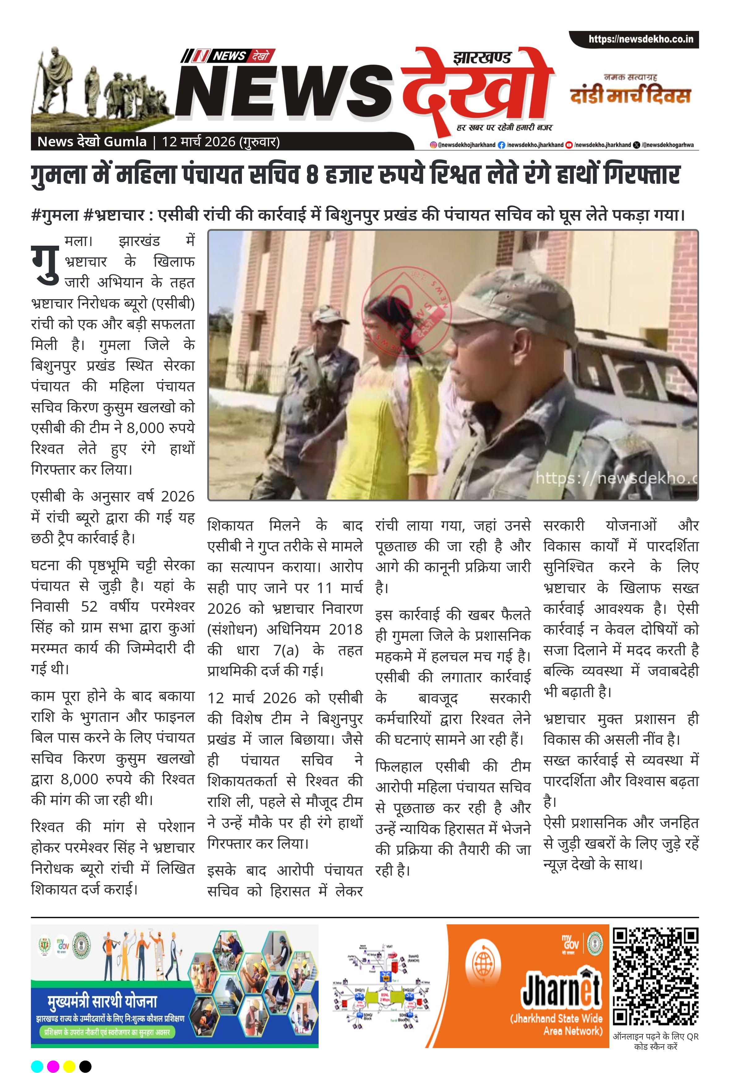 झारखंड में भ्रष्टाचार के खिलाफ चल रही कार्रवाई के बीच एसीबी रांची की टीम ने गुमला जिले में बड़ी कार्रवाई की है। बिशुनपुर प्रखंड की सेरका पंचायत की महिला पंचायत सचिव किरण कुसुम खलखो को 8 हजार रुपये रिश्वत लेते रंगे हाथों गिरफ्तार किया गया है। एसीबी की यह वर्ष 2026 की छठी ट्रैप कार्रवाई बताई जा रही है।