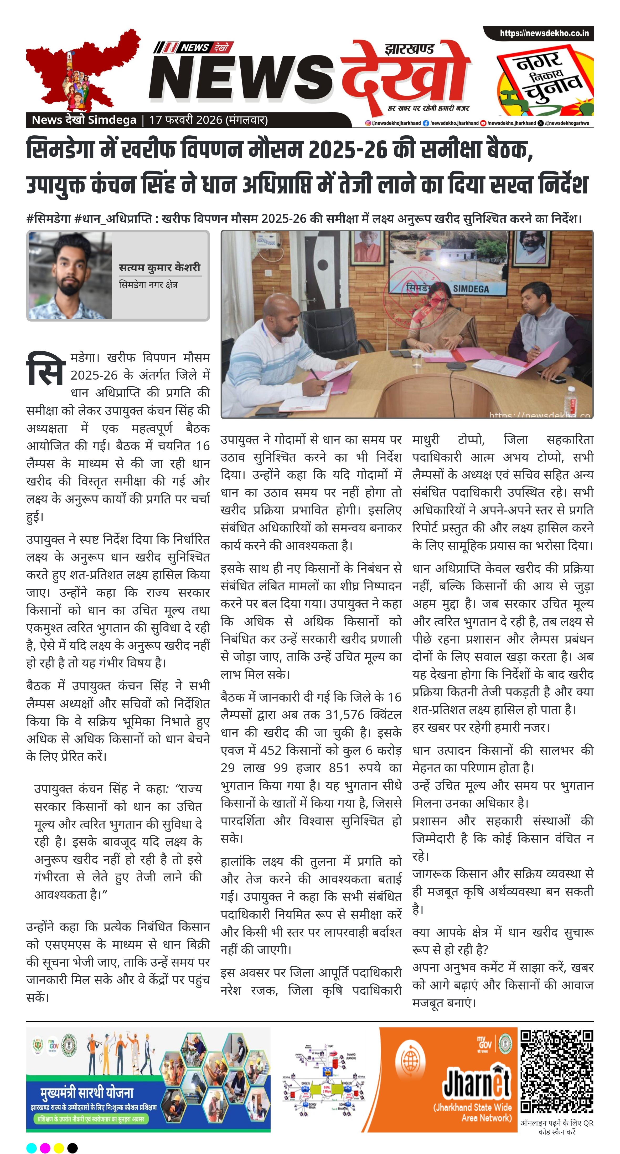 सिमडेगा में उपायुक्त कंचन सिंह की अध्यक्षता में खरीफ विपणन मौसम 2025-26 के तहत धान अधिप्राप्ति की प्रगति की समीक्षा बैठक आयोजित हुई। जिले के 16 लैम्पस के माध्यम से हो रही खरीद की स्थिति पर विस्तार से चर्चा की गई। अब तक 31,576 क्विंटल धान की खरीद कर 452 किसानों को 6.29 करोड़ रुपये से अधिक का भुगतान किया गया है। उपायुक्त ने लक्ष्य के अनुरूप शत-प्रतिशत खरीद सुनिश्चित करने के निर्देश दिए।