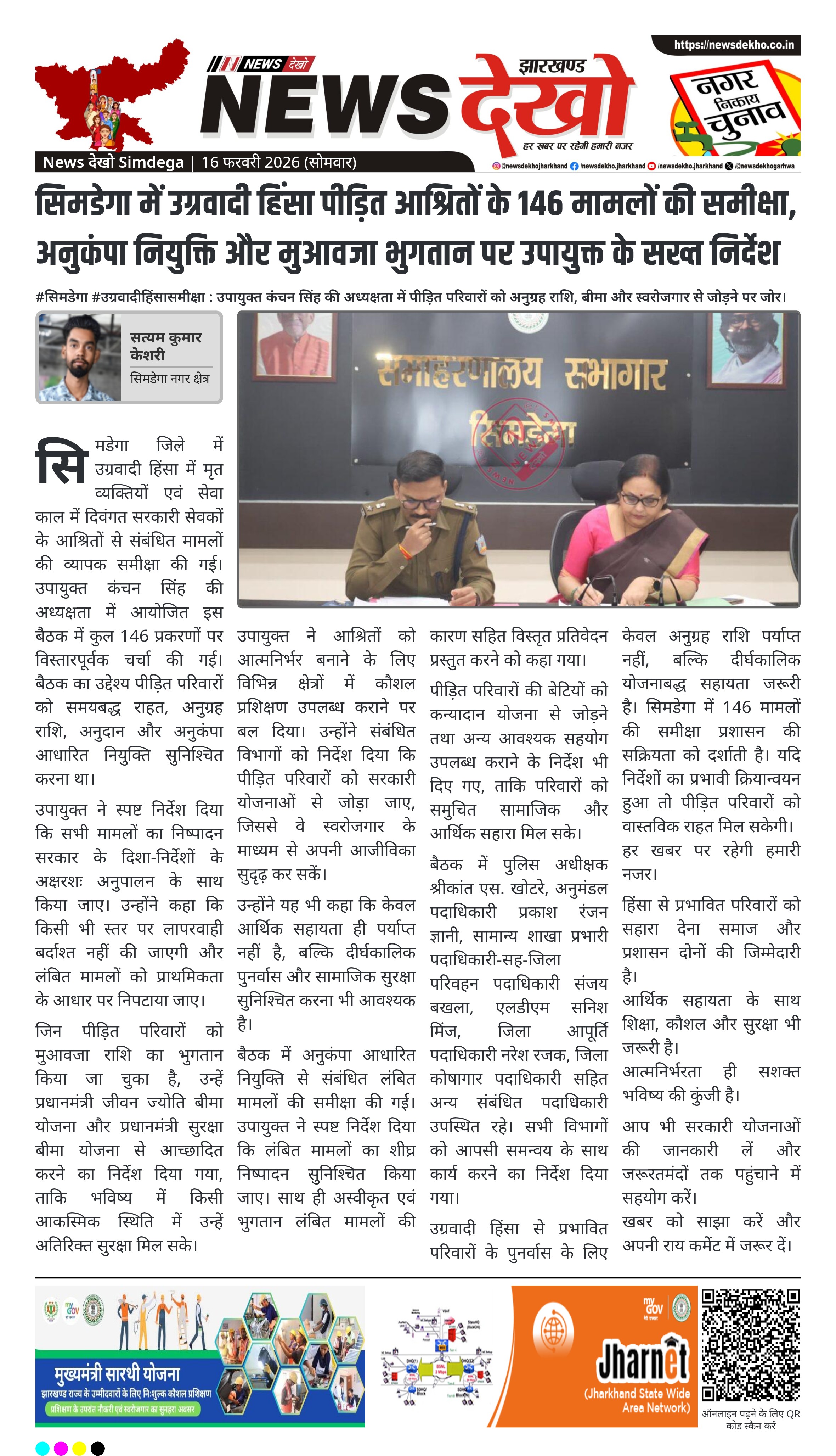 सिमडेगा में उपायुक्त कंचन सिंह की अध्यक्षता में उग्रवादी हिंसा पीड़ित आश्रितों के 146 मामलों की व्यापक समीक्षा की गई। बैठक में अनुग्रह राशि, अनुकंपा नियुक्ति, लंबित और अस्वीकृत आवेदनों पर विस्तार से चर्चा हुई। पीड़ित परिवारों को बीमा, कौशल प्रशिक्षण और सरकारी योजनाओं से जोड़ने के निर्देश दिए गए।