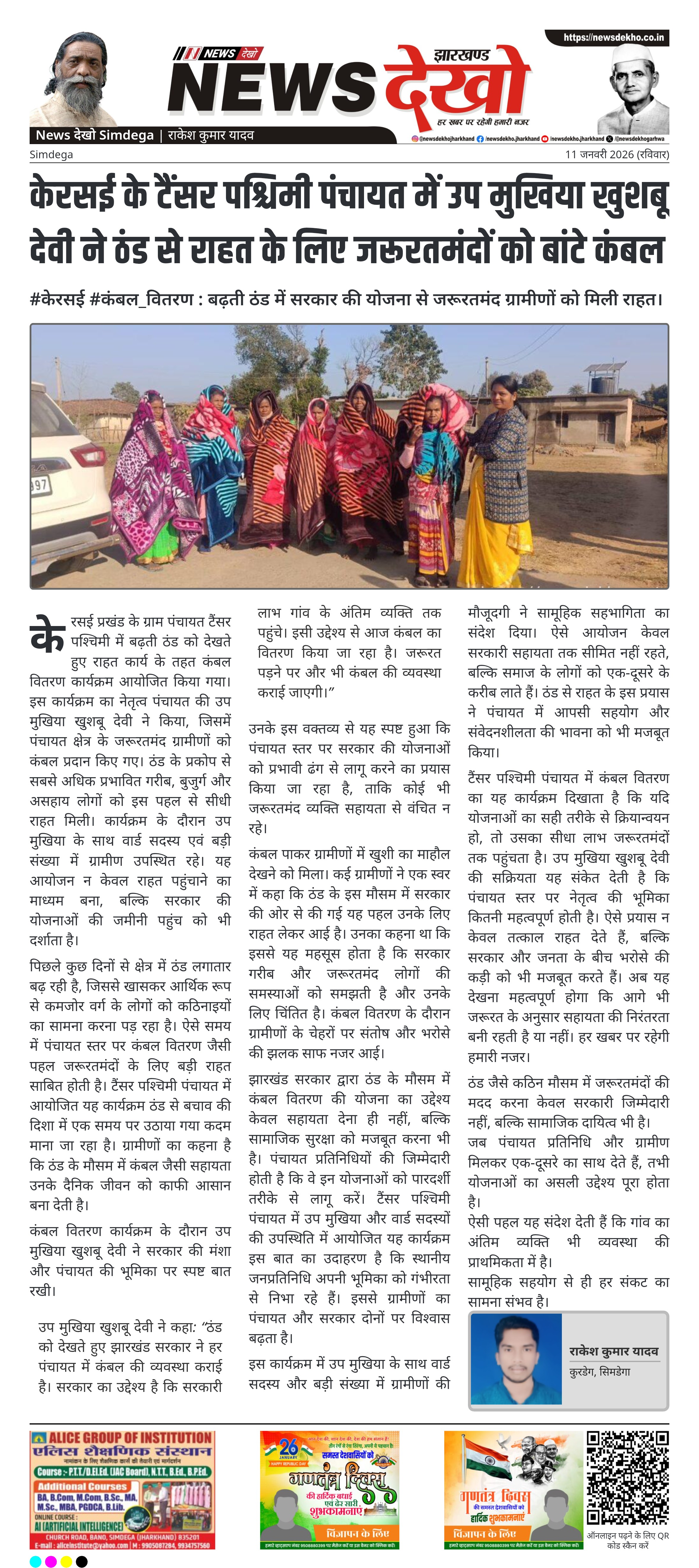 केरसई प्रखंड के ग्राम पंचायत टैंसर पश्चिमी में बढ़ती ठंड को देखते हुए राहत कार्य के तहत कंबल वितरण कार्यक्रम आयोजित किया गया। इस कार्यक्रम का नेतृत्व पंचायत की उप मुखिया खुशबू देवी ने किया, जिसमें पंचायत क्षेत्र के जरूरतमंद ग्रामीणों को कंबल प्रदान किए गए। ठंड के प्रकोप से सबसे अधिक प्रभावित गरीब, बुजुर्ग और असहाय लोगों को इस पहल से सीधी राहत मिली। कार्यक्रम के दौरान उप मुखिया के साथ वार्ड सदस्य एवं बड़ी संख्या में ग्रामीण उपस्थित रहे। यह आयोजन न केवल राहत पहुंचाने का माध्यम बना, बल्कि सरकार की योजनाओं की जमीनी पहुंच को भी दर्शाता है।
