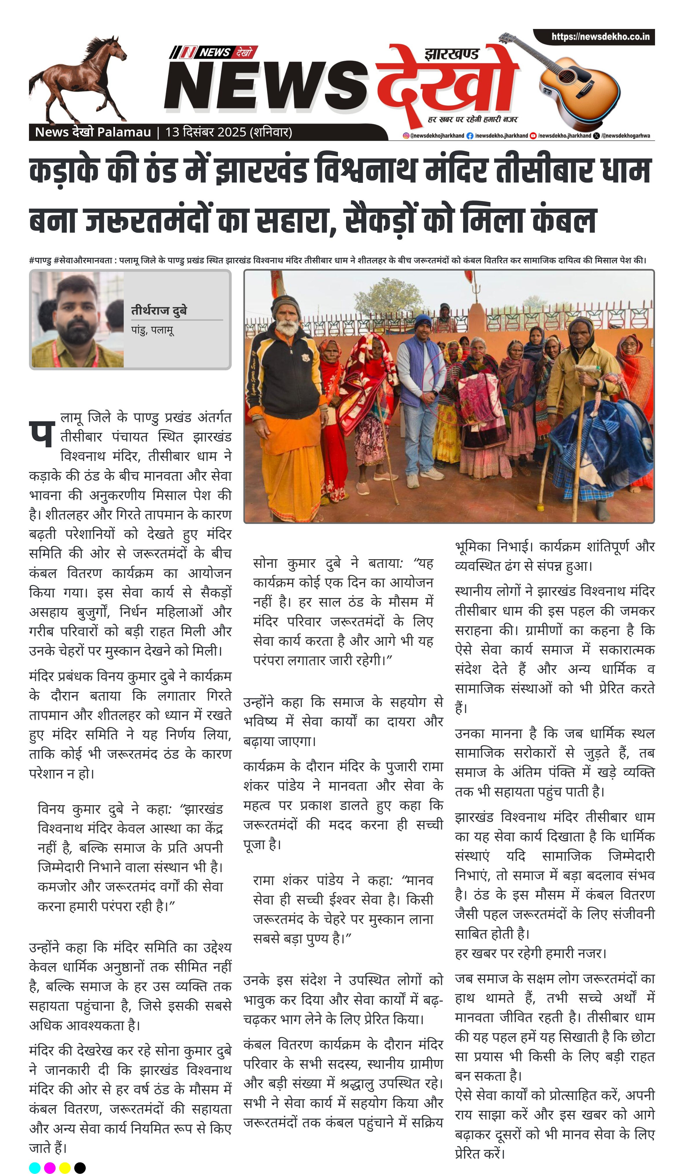 झारखंड विश्वनाथ मंदिर तीसीबार धाम का यह सेवा कार्य दिखाता है कि धार्मिक संस्थाएं यदि सामाजिक जिम्मेदारी निभाएं, तो समाज में बड़ा बदलाव संभव है। ठंड के इस मौसम में कंबल वितरण जैसी पहल जरूरतमंदों के लिए संजीवनी साबित होती है।