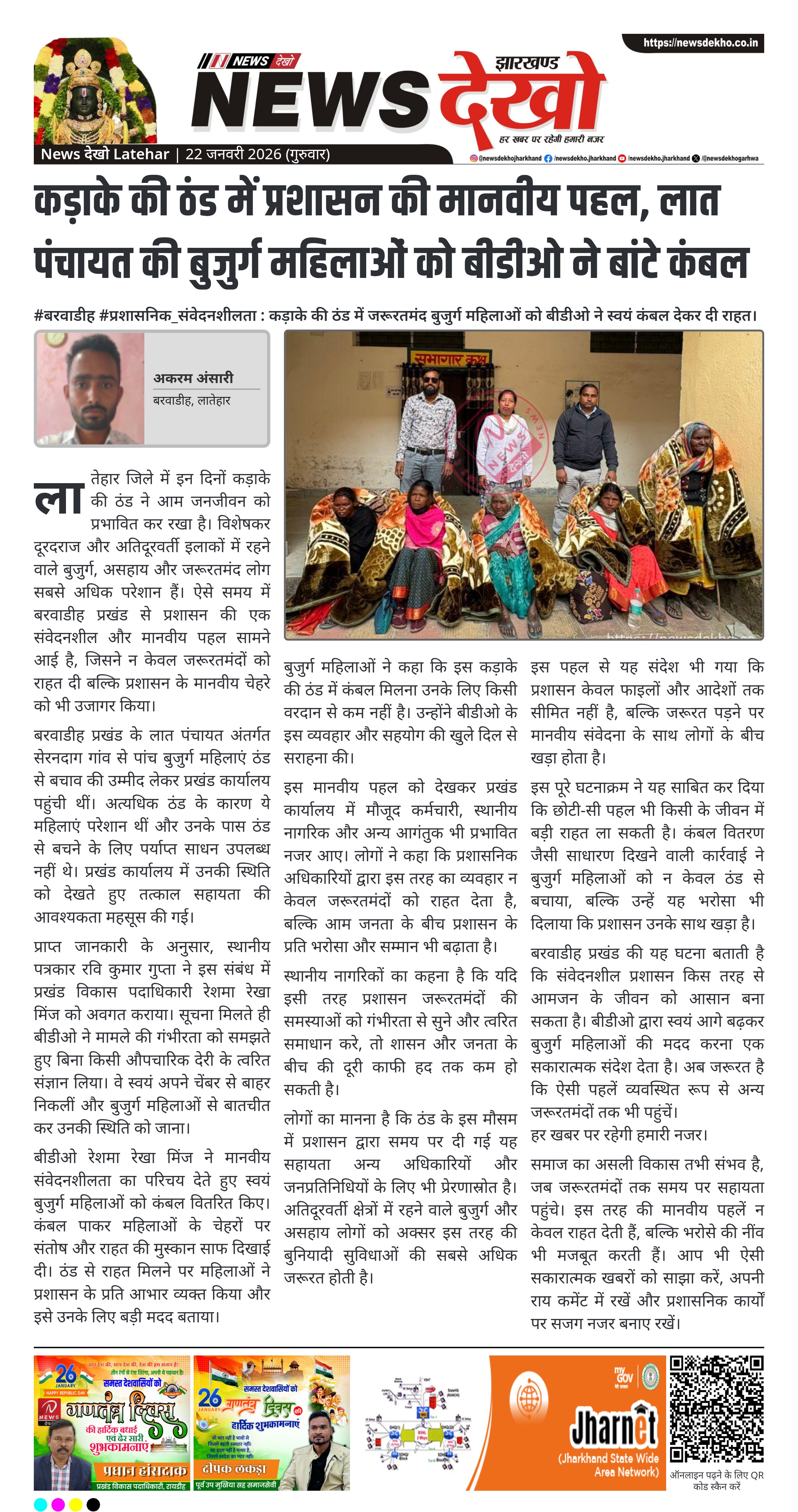 लातेहार जिले में इन दिनों कड़ाके की ठंड ने आम जनजीवन को प्रभावित कर रखा है। विशेषकर दूरदराज और अतिदूरवर्ती इलाकों में रहने वाले बुजुर्ग, असहाय और जरूरतमंद लोग सबसे अधिक परेशान हैं। ऐसे समय में बरवाडीह प्रखंड से प्रशासन की एक संवेदनशील और मानवीय पहल सामने आई है, जिसने न केवल जरूरतमंदों को राहत दी बल्कि प्रशासन के मानवीय चेहरे को भी उजागर किया।