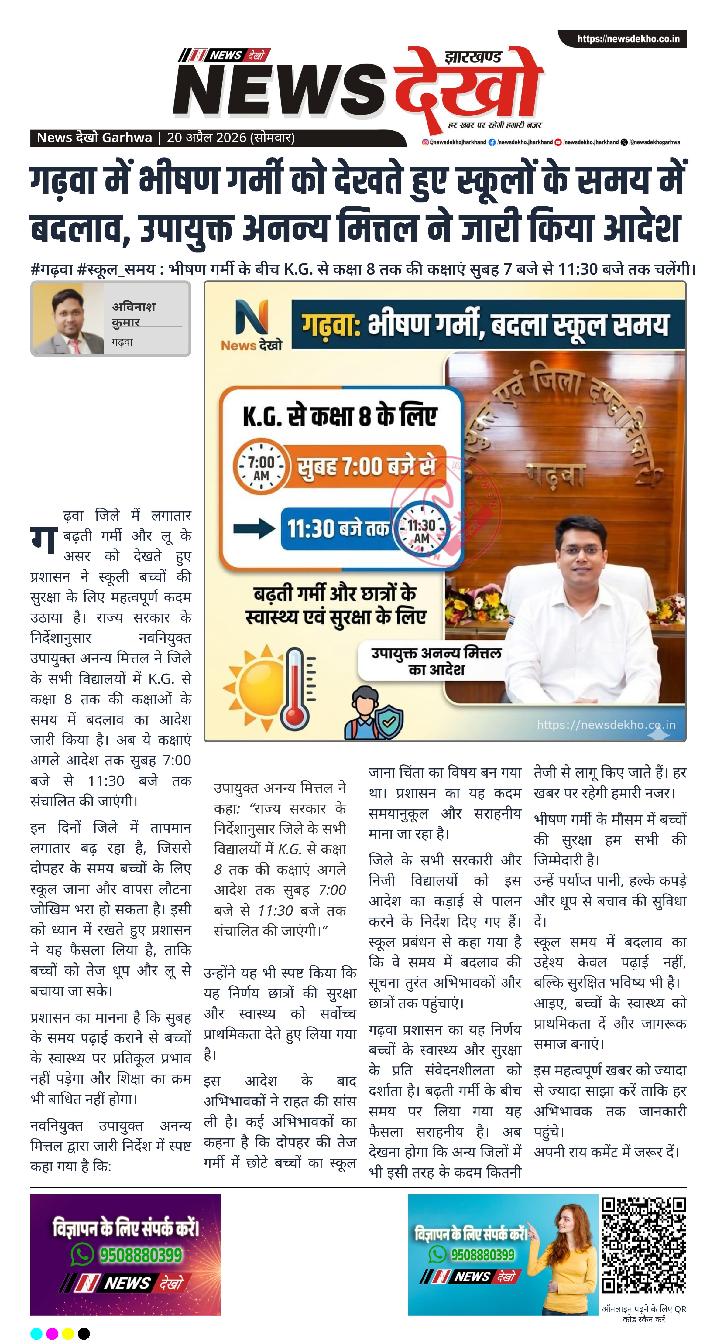 गढ़वा जिले में लगातार बढ़ती गर्मी और लू के असर को देखते हुए प्रशासन ने स्कूली बच्चों की सुरक्षा के लिए महत्वपूर्ण कदम उठाया है। राज्य सरकार के निर्देशानुसार नवनियुक्त उपायुक्त अनन्य मित्तल ने जिले के सभी विद्यालयों में K.G. से कक्षा 8 तक की कक्षाओं के समय में बदलाव का आदेश जारी किया है। अब ये कक्षाएं अगले आदेश तक सुबह 7:00 बजे से 11:30 बजे तक संचालित की जाएंगी।