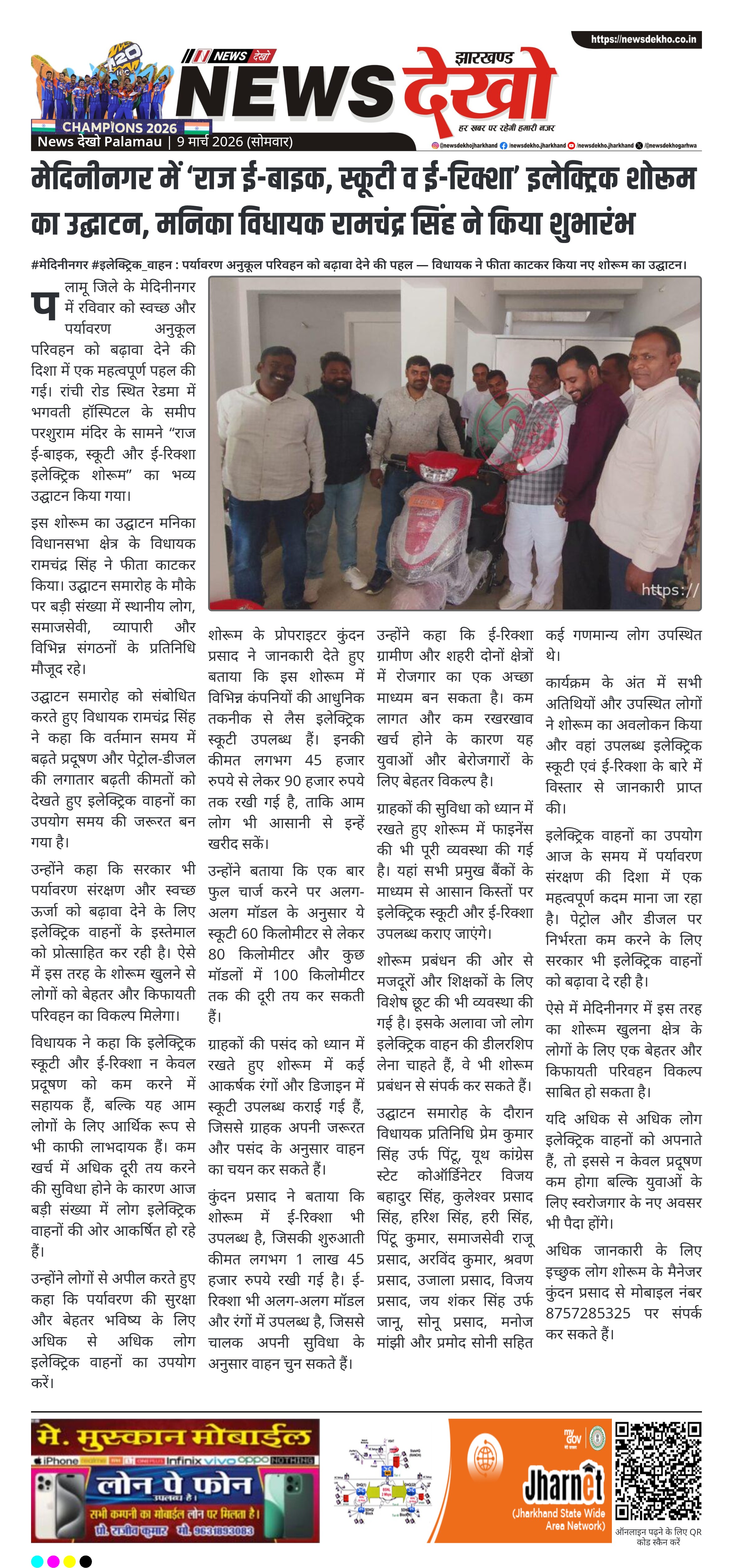 पलामू जिले के मेदिनीनगर में स्वच्छ और पर्यावरण अनुकूल परिवहन को बढ़ावा देने के उद्देश्य से ‘राज ई-बाइक, स्कूटी और ई-रिक्शा’ इलेक्ट्रिक शोरूम का उद्घाटन किया गया। मनिका विधायक रामचंद्र सिंह ने फीता काटकर शोरूम का शुभारंभ किया। इस मौके पर बड़ी संख्या में स्थानीय लोग और गणमान्य नागरिक उपस्थित रहे।