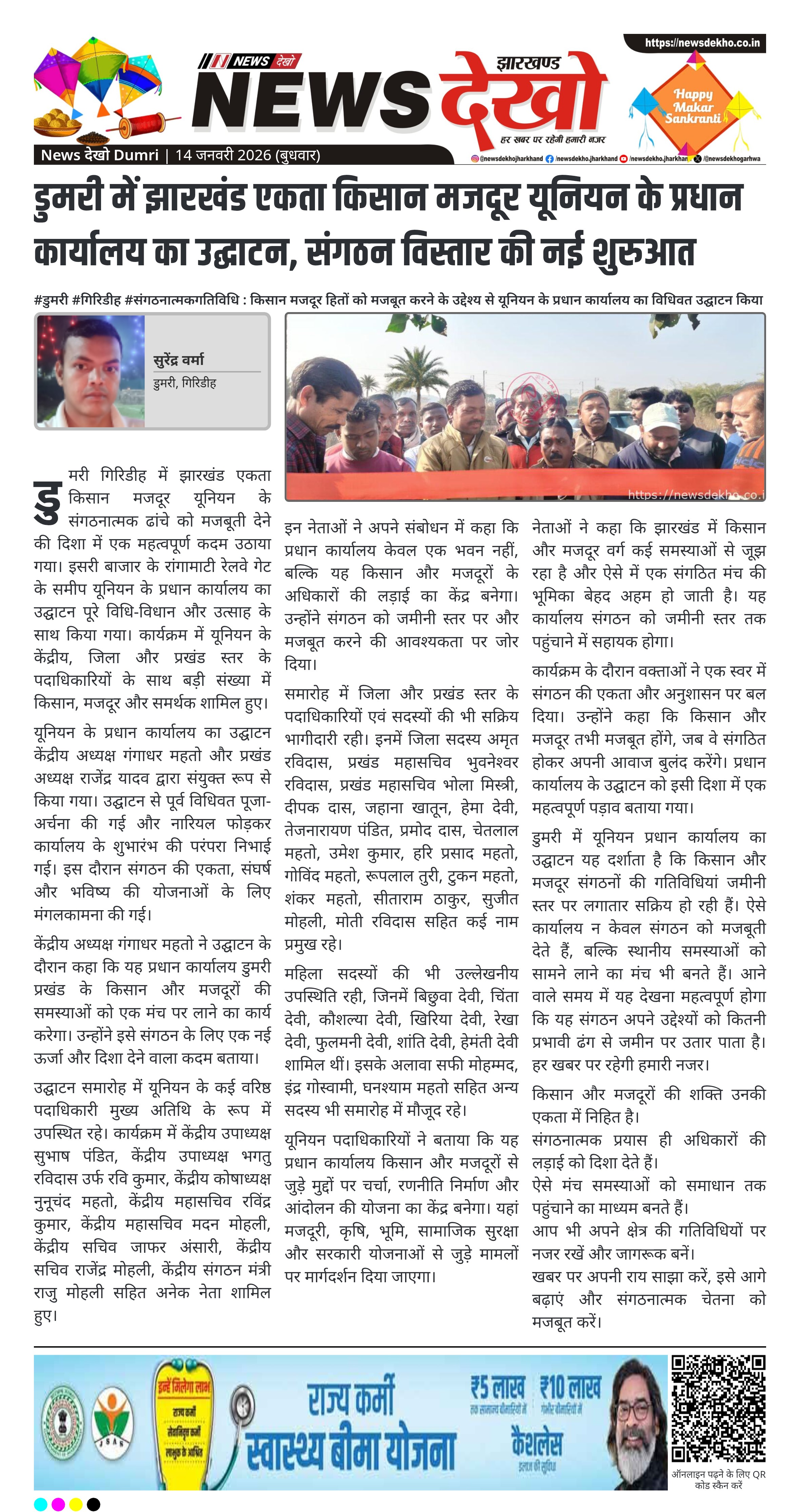 डुमरी प्रखंड के इसरी बाजार स्थित रांगामाटी रेलवे गेट के पास झारखंड एकता किसान मजदूर यूनियन के प्रधान कार्यालय का उद्घाटन किया गया। उद्घाटन कार्यक्रम यूनियन के केंद्रीय और प्रखंड स्तरीय नेतृत्व की उपस्थिति में विधिवत पूजा-अर्चना के साथ संपन्न हुआ। इस अवसर पर संगठन विस्तार, मजदूर-किसान हित और संघर्ष को मजबूती देने का संकल्प लिया गया। यह कार्यालय क्षेत्र में यूनियन की गतिविधियों का मुख्य केंद्र बनेगा।