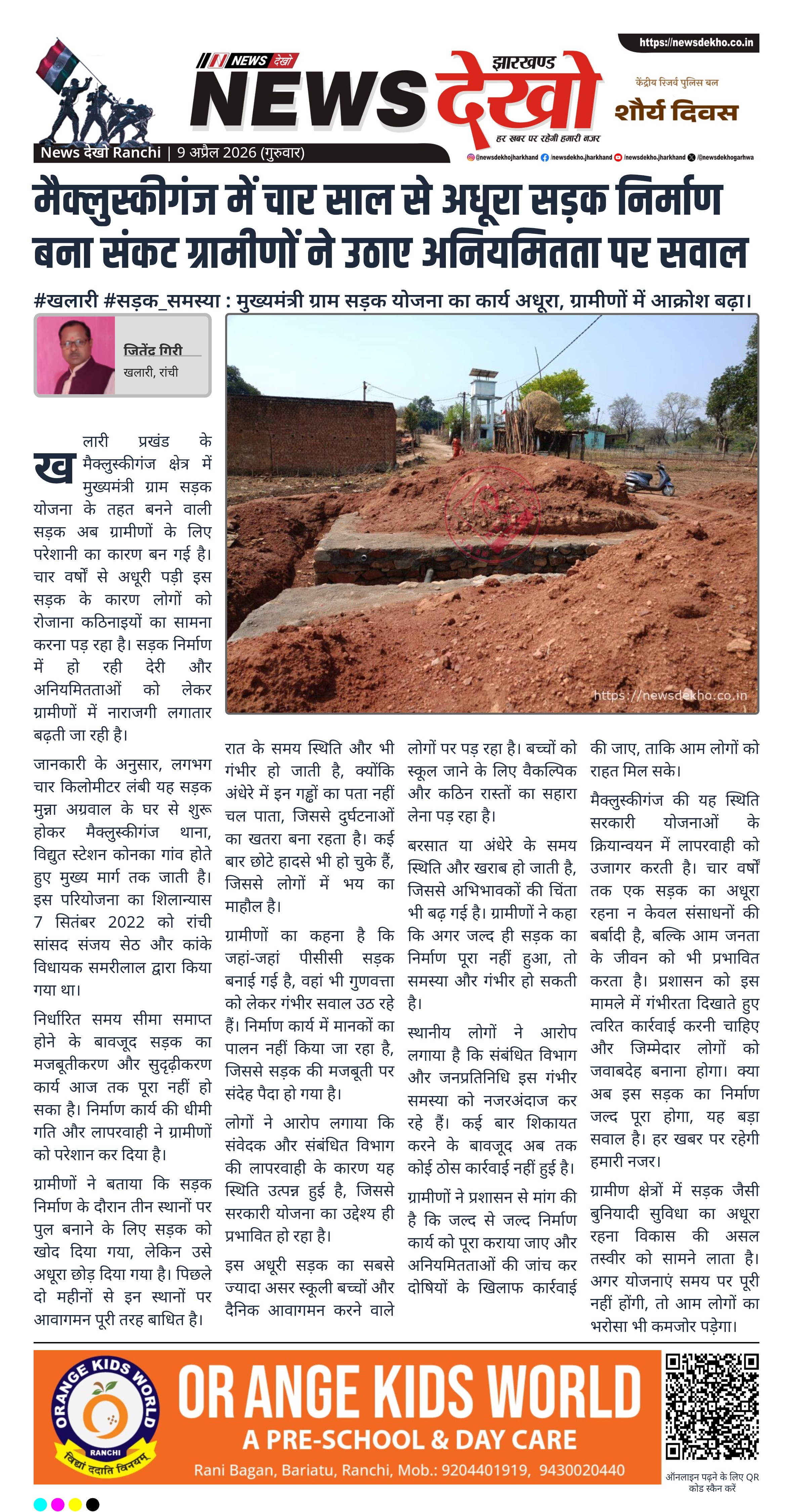 मैक्लुस्कीगंज की यह स्थिति सरकारी योजनाओं के क्रियान्वयन में लापरवाही को उजागर करती है। चार वर्षों तक एक सड़क का अधूरा रहना न केवल संसाधनों की बर्बादी है, बल्कि आम जनता के जीवन को भी प्रभावित करता है। प्रशासन को इस मामले में गंभीरता दिखाते हुए त्वरित कार्रवाई करनी चाहिए और जिम्मेदार लोगों को जवाबदेह बनाना होगा। क्या अब इस सड़क का निर्माण जल्द पूरा होगा, यह बड़ा सवाल है। हर खबर पर रहेगी हमारी नजर।
