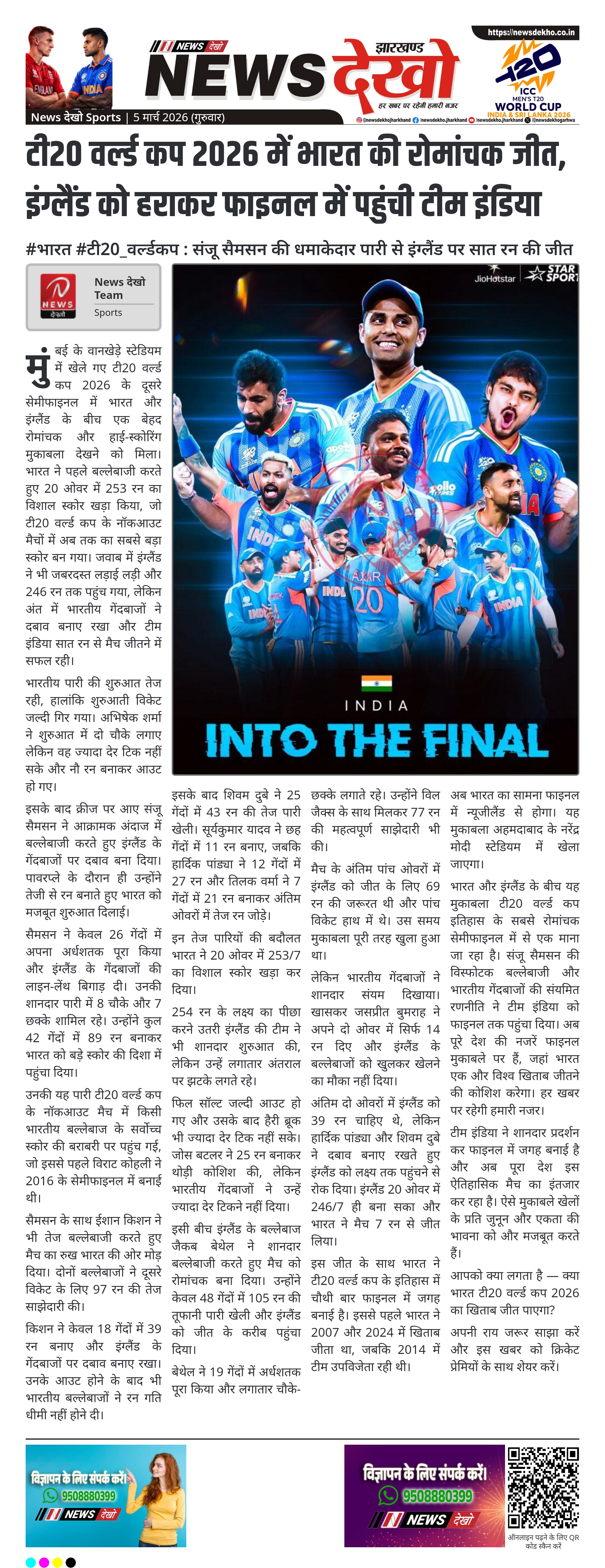 भारत और इंग्लैंड के बीच यह मुकाबला टी20 वर्ल्ड कप इतिहास के सबसे रोमांचक सेमीफाइनल में से एक माना जा रहा है। संजू सैमसन की विस्फोटक बल्लेबाजी और भारतीय गेंदबाजों की संयमित रणनीति ने टीम इंडिया को फाइनल तक पहुंचा दिया। अब पूरे देश की नजरें फाइनल मुकाबले पर हैं, जहां भारत एक और विश्व खिताब जीतने की कोशिश करेगा। हर खबर पर रहेगी हमारी नजर।