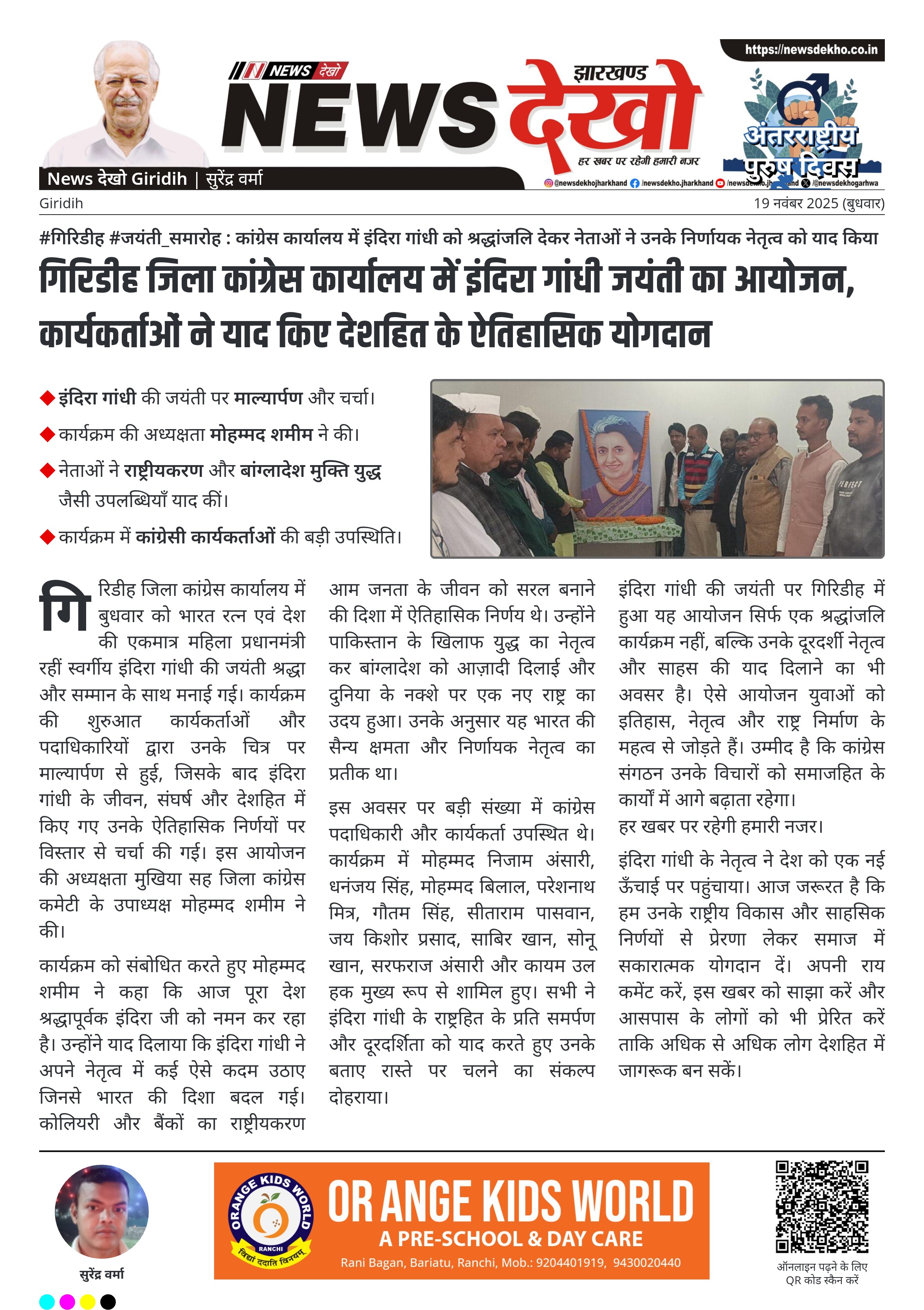 इंदिरा गांधी की जयंती पर गिरिडीह में हुआ यह आयोजन सिर्फ एक श्रद्धांजलि कार्यक्रम नहीं, बल्कि उनके दूरदर्शी नेतृत्व और साहस की याद दिलाने का भी अवसर है। ऐसे आयोजन युवाओं को इतिहास, नेतृत्व और राष्ट्र निर्माण के महत्व से जोड़ते हैं। उम्मीद है कि कांग्रेस संगठन उनके विचारों को समाजहित के कार्यों में आगे बढ़ाता रहेगा।