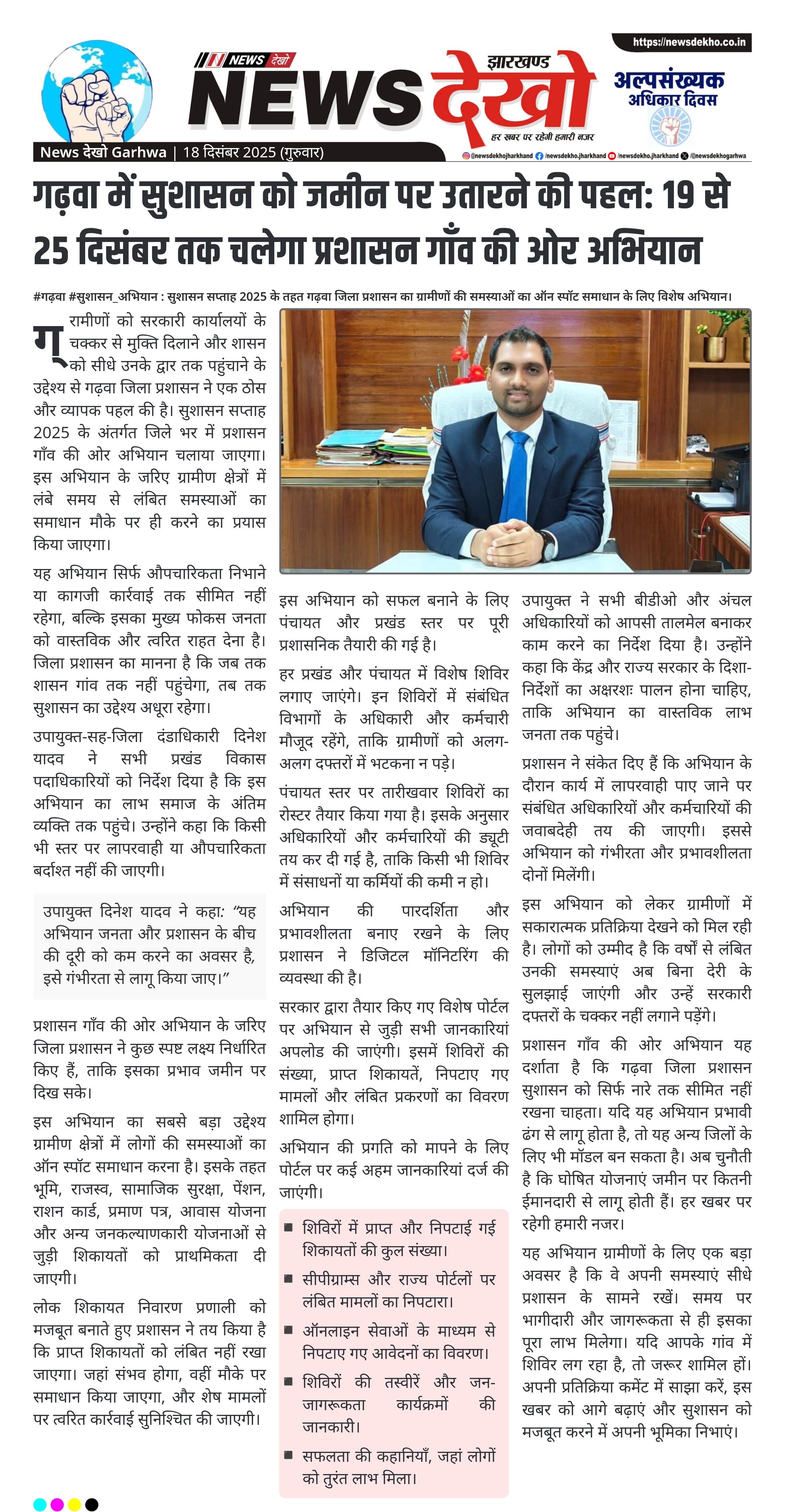 ग्रामीणों को सरकारी कार्यालयों के चक्कर से मुक्ति दिलाने और शासन को सीधे उनके द्वार तक पहुंचाने के उद्देश्य से गढ़वा जिला प्रशासन ने एक ठोस और व्यापक पहल की है। सुशासन सप्ताह 2025 के अंतर्गत जिले भर में प्रशासन गाँव की ओर अभियान चलाया जाएगा। इस अभियान के जरिए ग्रामीण क्षेत्रों में लंबे समय से लंबित समस्याओं का समाधान मौके पर ही करने का प्रयास किया जाएगा।