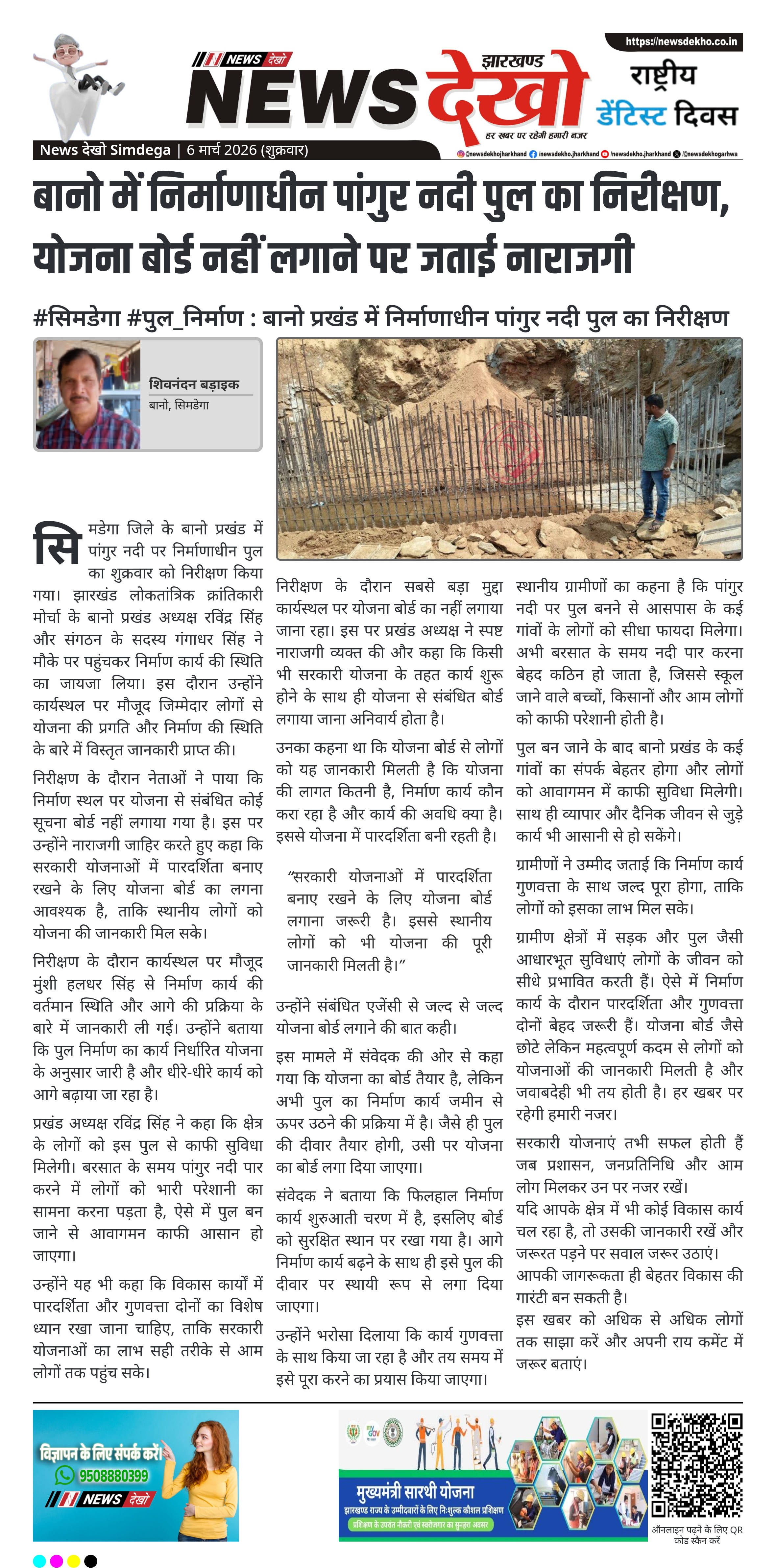 सिमडेगा जिले के बानो प्रखंड में निर्माणाधीन पांगुर नदी पुल का निरीक्षण झारखंड लोकतांत्रिक क्रांतिकारी मोर्चा के प्रखंड अध्यक्ष रविंद्र सिंह ने किया। निरीक्षण के दौरान योजना से संबंधित सूचना बोर्ड नहीं लगाए जाने पर नाराजगी जताई गई। कार्यस्थल पर मौजूद मुंशी से निर्माण कार्य की प्रगति की जानकारी ली गई।