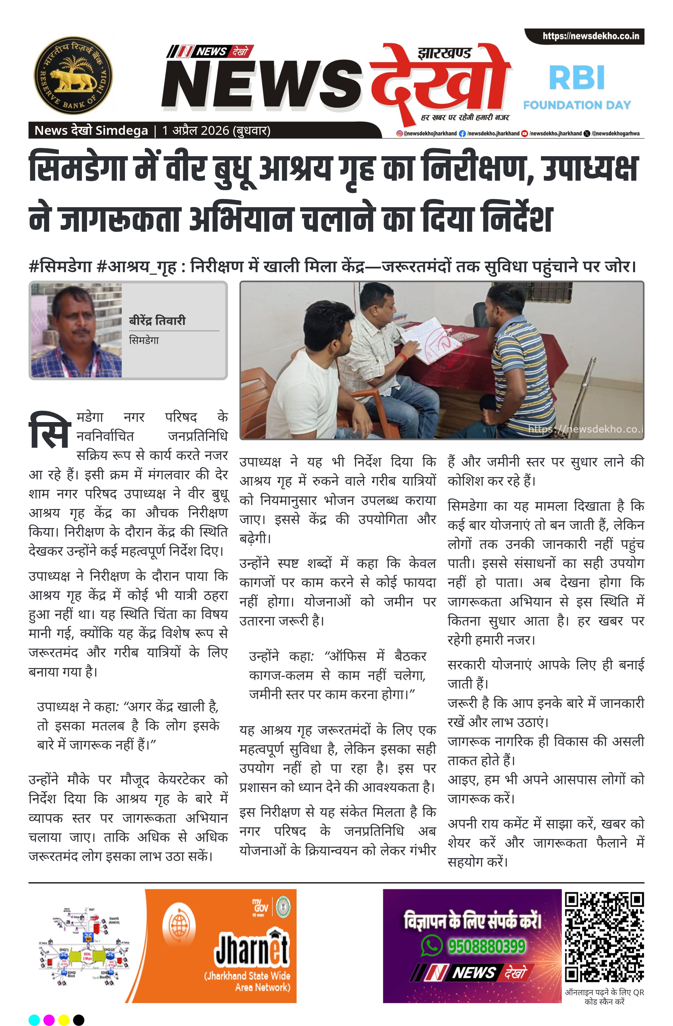 सिमडेगा में नगर परिषद उपाध्यक्ष ने वीर बुधू आश्रय गृह केंद्र का निरीक्षण किया। निरीक्षण के दौरान केंद्र खाली पाया गया, जिस पर उन्होंने नाराजगी जताई। उपाध्यक्ष ने केयरटेकर को जागरूकता अभियान चलाने और जरूरतमंदों तक सुविधा पहुंचाने का निर्देश दिया। उन्होंने रात में रुकने वाले यात्रियों के लिए भोजन की व्यवस्था सुनिश्चित करने को भी कहा।