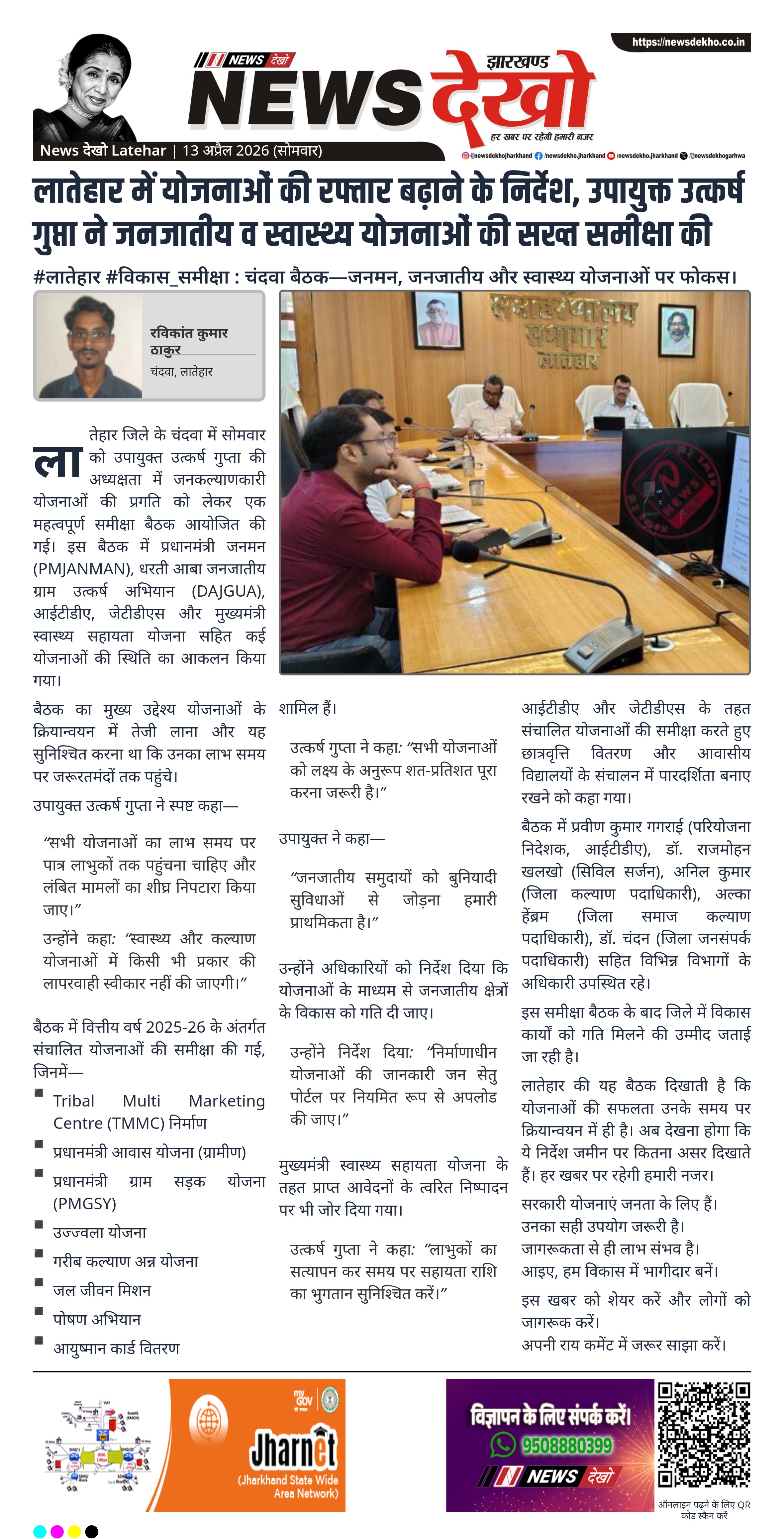 लातेहार जिले के चंदवा में सोमवार को उपायुक्त उत्कर्ष गुप्ता की अध्यक्षता में जनकल्याणकारी योजनाओं की प्रगति को लेकर एक महत्वपूर्ण समीक्षा बैठक आयोजित की गई। इस बैठक में प्रधानमंत्री जनमन (PMJANMAN), धरती आबा जनजातीय ग्राम उत्कर्ष अभियान (DAJGUA), आईटीडीए, जेटीडीएस और मुख्यमंत्री स्वास्थ्य सहायता योजना सहित कई योजनाओं की स्थिति का आकलन किया गया।