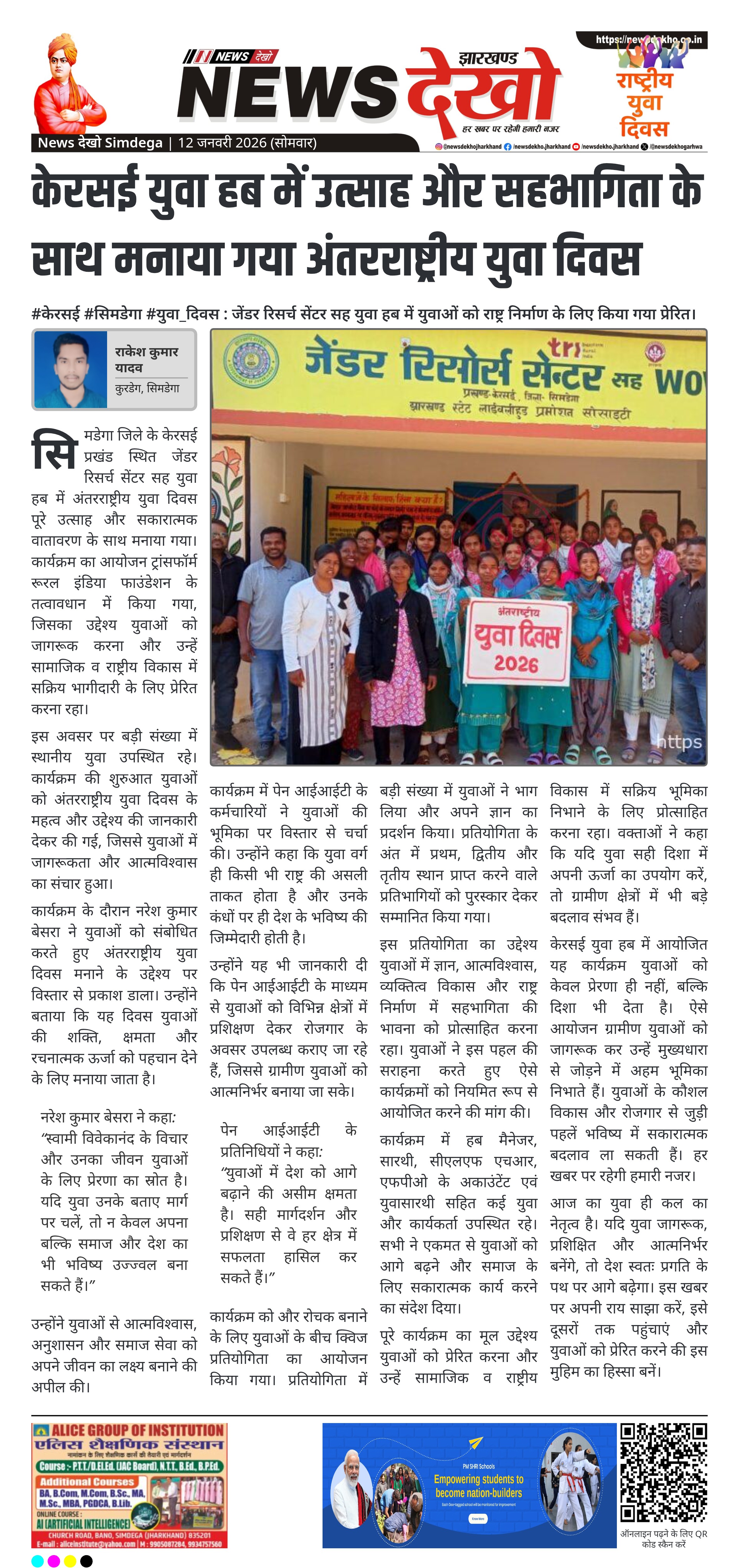 सिमडेगा जिले के केरसई स्थित जेंडर रिसर्च सेंटर सह युवा हब में अंतरराष्ट्रीय युवा दिवस के अवसर पर विशेष कार्यक्रम का आयोजन किया गया। यह आयोजन ट्रांसफॉर्म रूरल इंडिया फाउंडेशन के माध्यम से किया गया, जिसमें युवाओं की भूमिका और राष्ट्र निर्माण में उनके योगदान पर जोर दिया गया। कार्यक्रम में स्वामी विवेकानंद के विचारों से प्रेरणा लेने का संदेश दिया गया। साथ ही युवाओं के कौशल विकास और रोजगार के अवसरों पर भी विस्तार से चर्चा हुई।