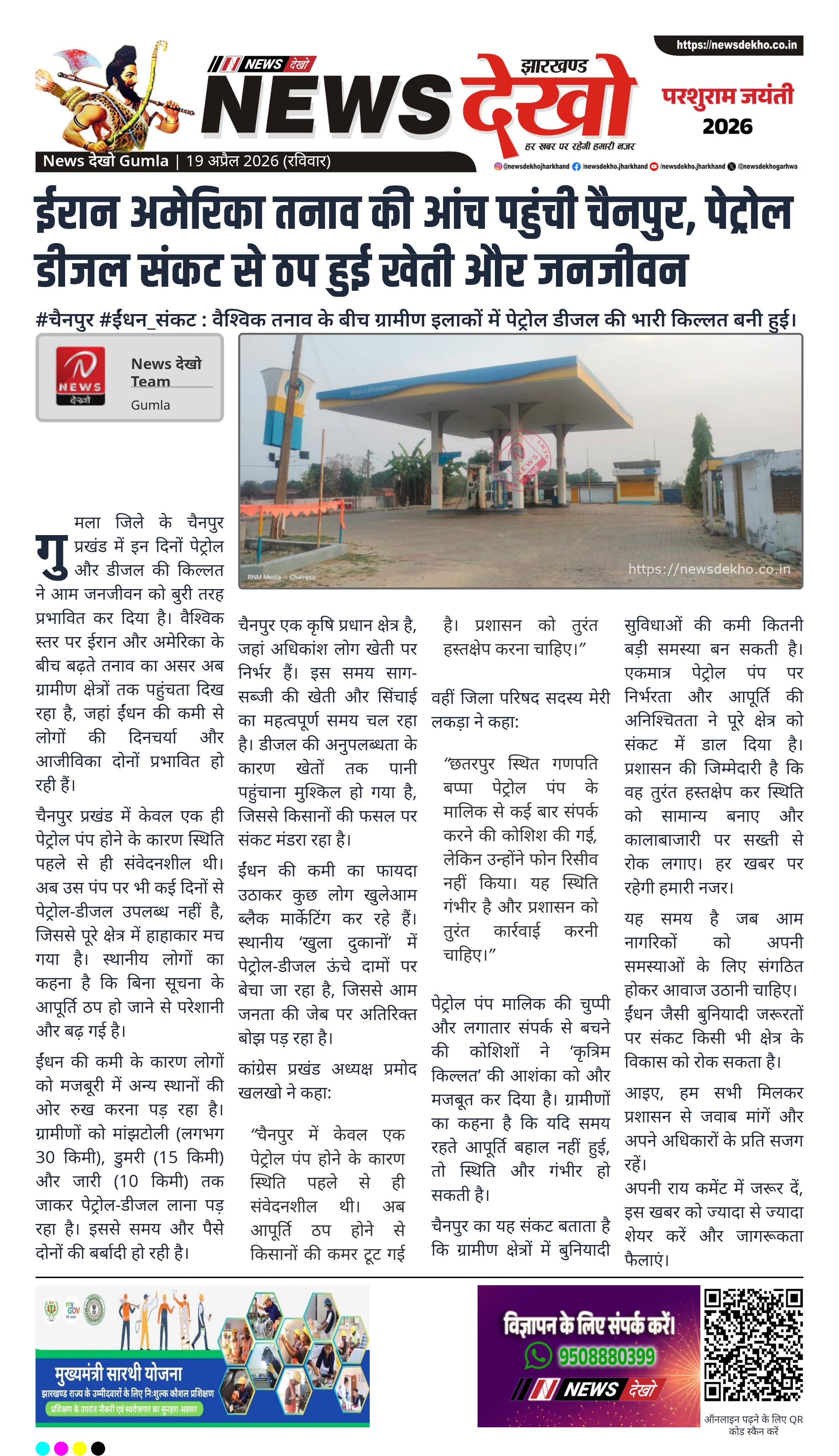 गुमला जिले के चैनपुर प्रखंड में इन दिनों पेट्रोल और डीजल की किल्लत ने आम जनजीवन को बुरी तरह प्रभावित कर दिया है। वैश्विक स्तर पर ईरान और अमेरिका के बीच बढ़ते तनाव का असर अब ग्रामीण क्षेत्रों तक पहुंचता दिख रहा है, जहां ईंधन की कमी से लोगों की दिनचर्या और आजीविका दोनों प्रभावित हो रही हैं।