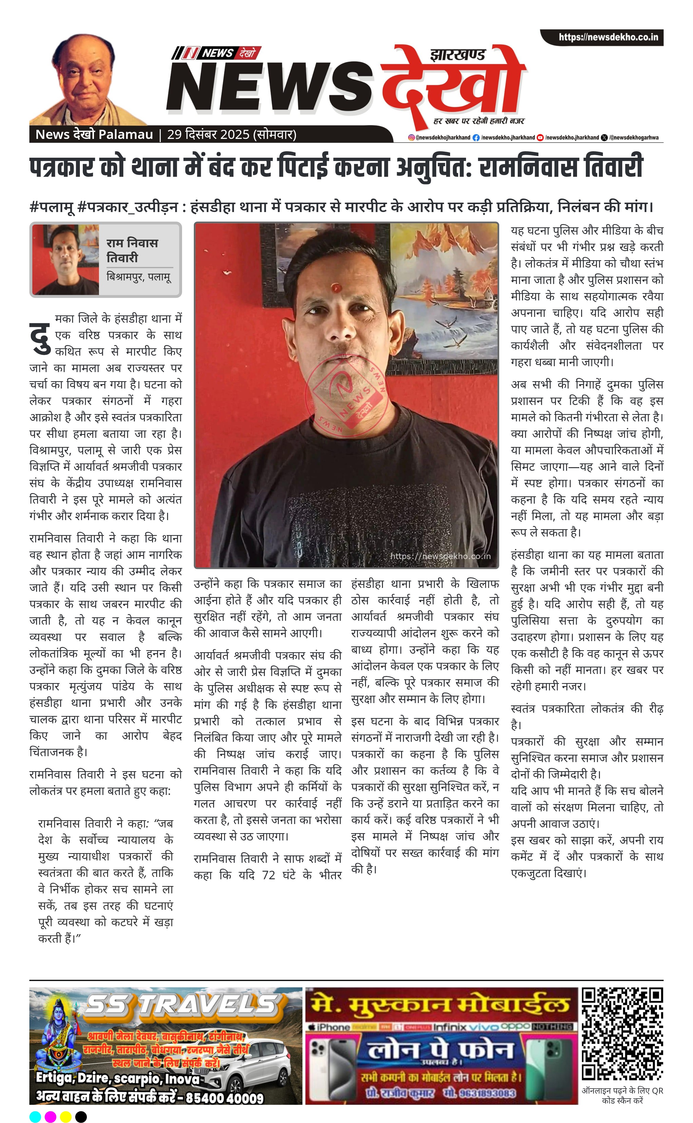 #पलामू #पत्रकार_उत्पीड़न : हंसडीहा थाना में पत्रकार से मारपीट के आरोप पर कड़ी प्रतिक्रिया, निलंबन की मांग।