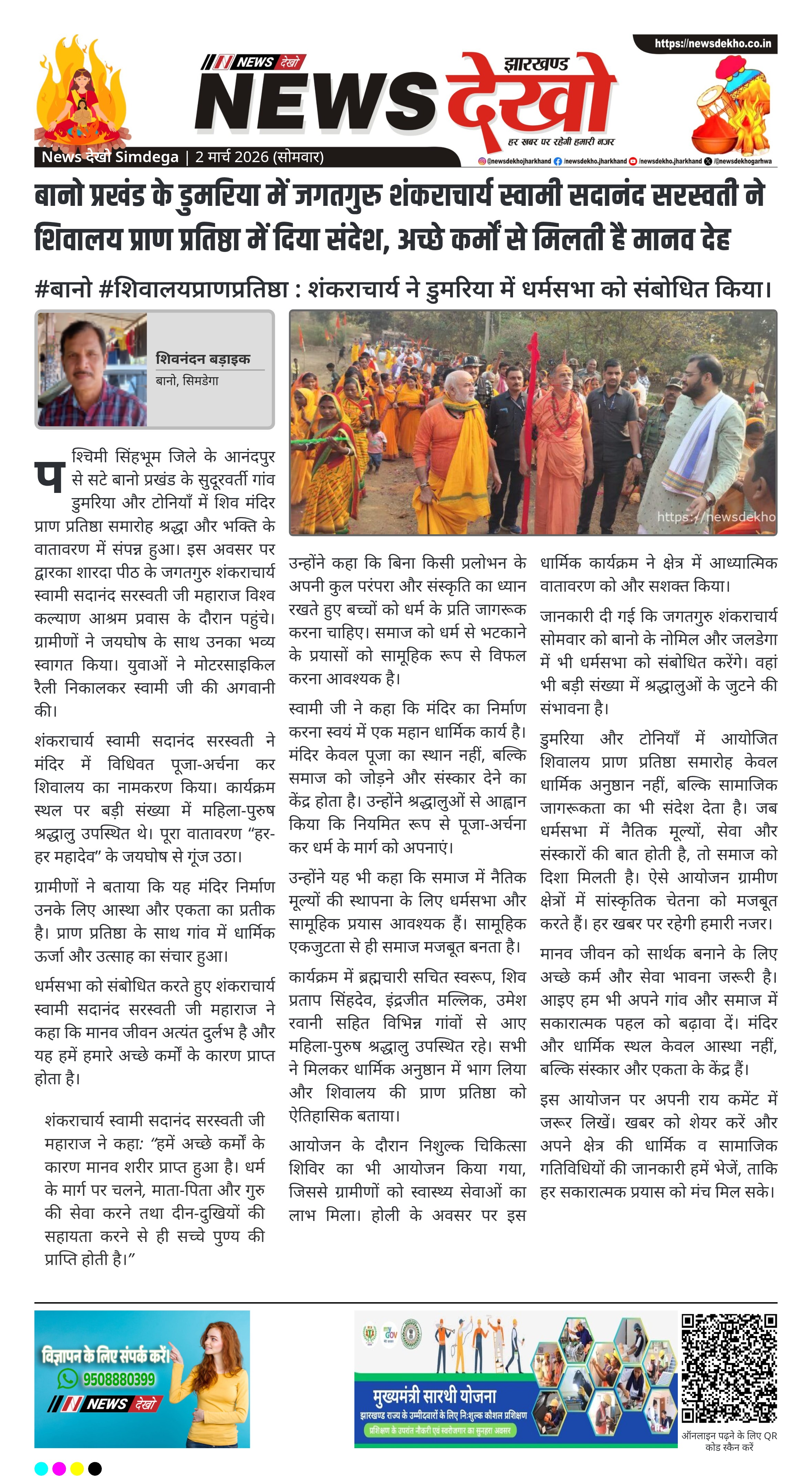पश्चिमी सिंहभूम के आनंदपुर से सटे बानो प्रखंड अंतर्गत डुमरिया और टोनियाँ गांव में शिव मंदिर प्राण प्रतिष्ठा समारोह संपन्न हुआ। द्वारका शारदा पीठ के जगतगुरु शंकराचार्य स्वामी सदानंद सरस्वती जी महाराज ने धर्मसभा को संबोधित करते हुए अच्छे कर्मों और धर्म पालन का संदेश दिया। ग्रामीणों ने भव्य स्वागत किया।
