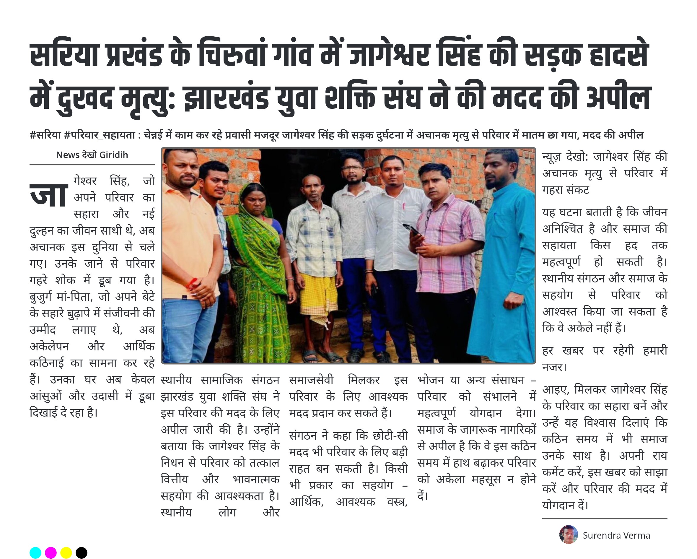 - इस कठिन समय में झारखंड युवा शक्ति संघ ने परिवार की मदद के लिए अपील की है।