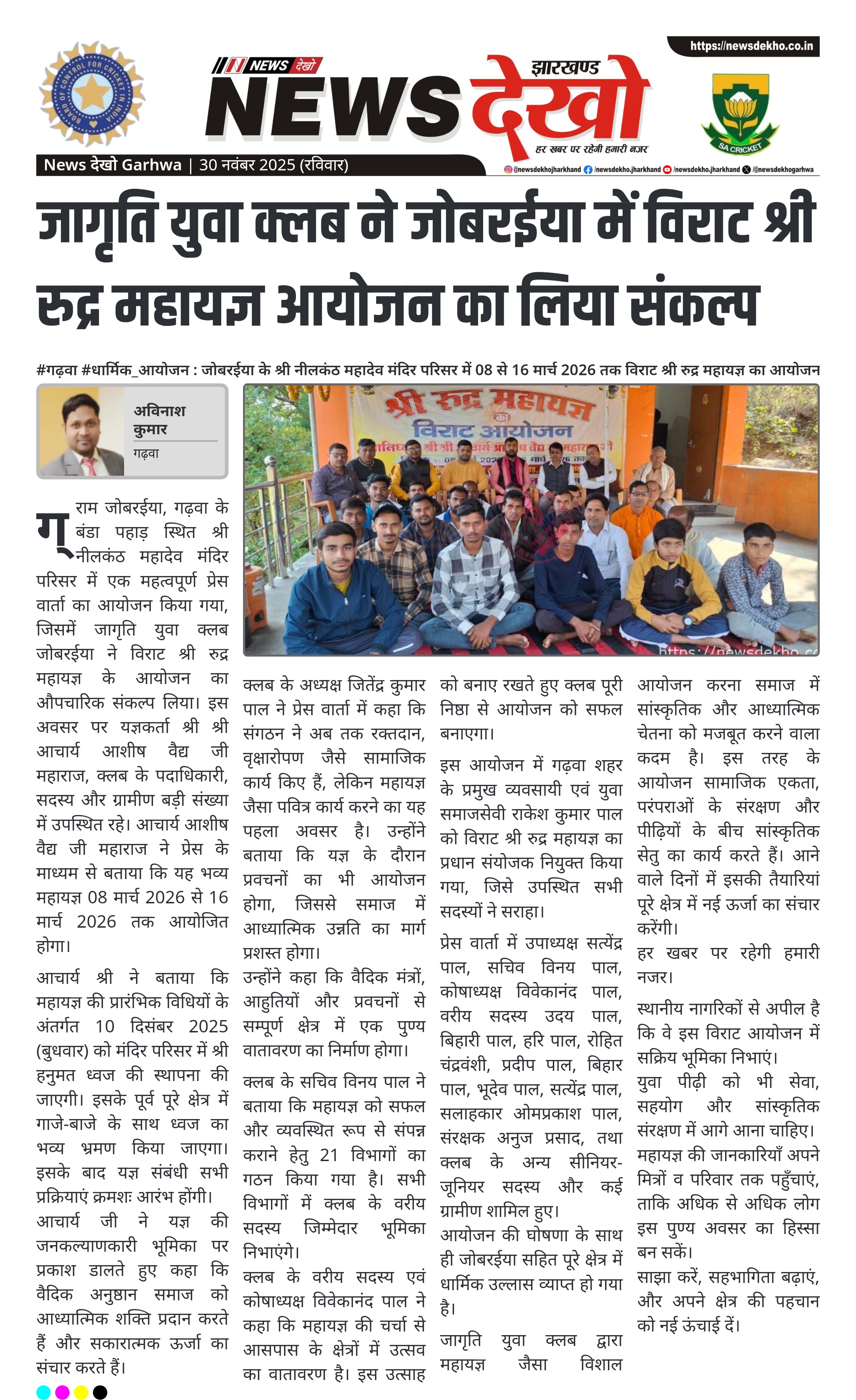 • जागृति युवा क्लब जोबरईया ने विराट श्री रुद्र महायज्ञ आयोजित करने का संकल्प लिया।