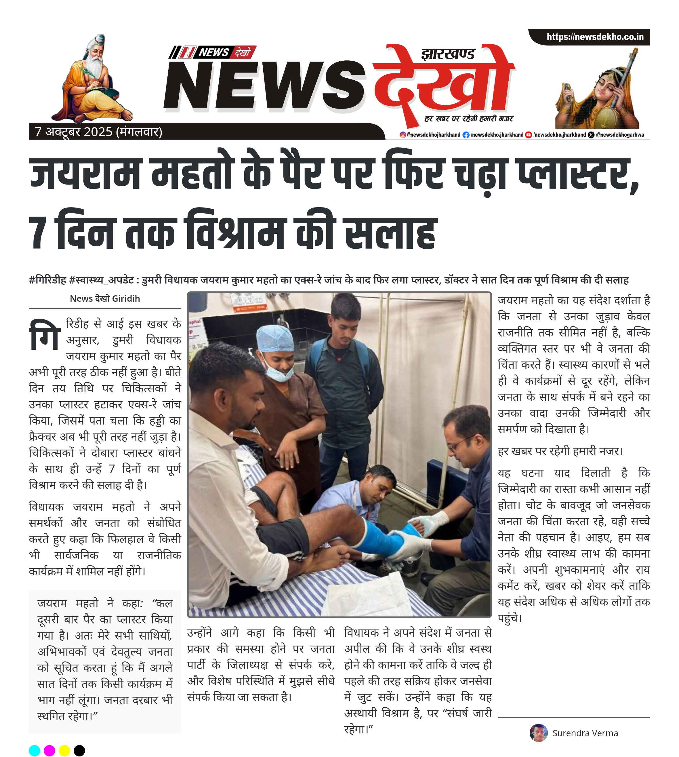 गिरिडीह से आई इस खबर के अनुसार, डुमरी विधायक जयराम कुमार महतो का पैर अभी पूरी तरह ठीक नहीं हुआ है। बीते दिन तय तिथि पर चिकित्सकों ने उनका प्लास्टर हटाकर एक्स-रे जांच किया, जिसमें पता चला कि हड्डी का फ्रैक्चर अब भी पूरी तरह नहीं जुड़ा है। चिकित्सकों ने दोबारा प्लास्टर बांधने के साथ ही उन्हें 7 दिनों का पूर्ण विश्राम करने की सलाह दी है।