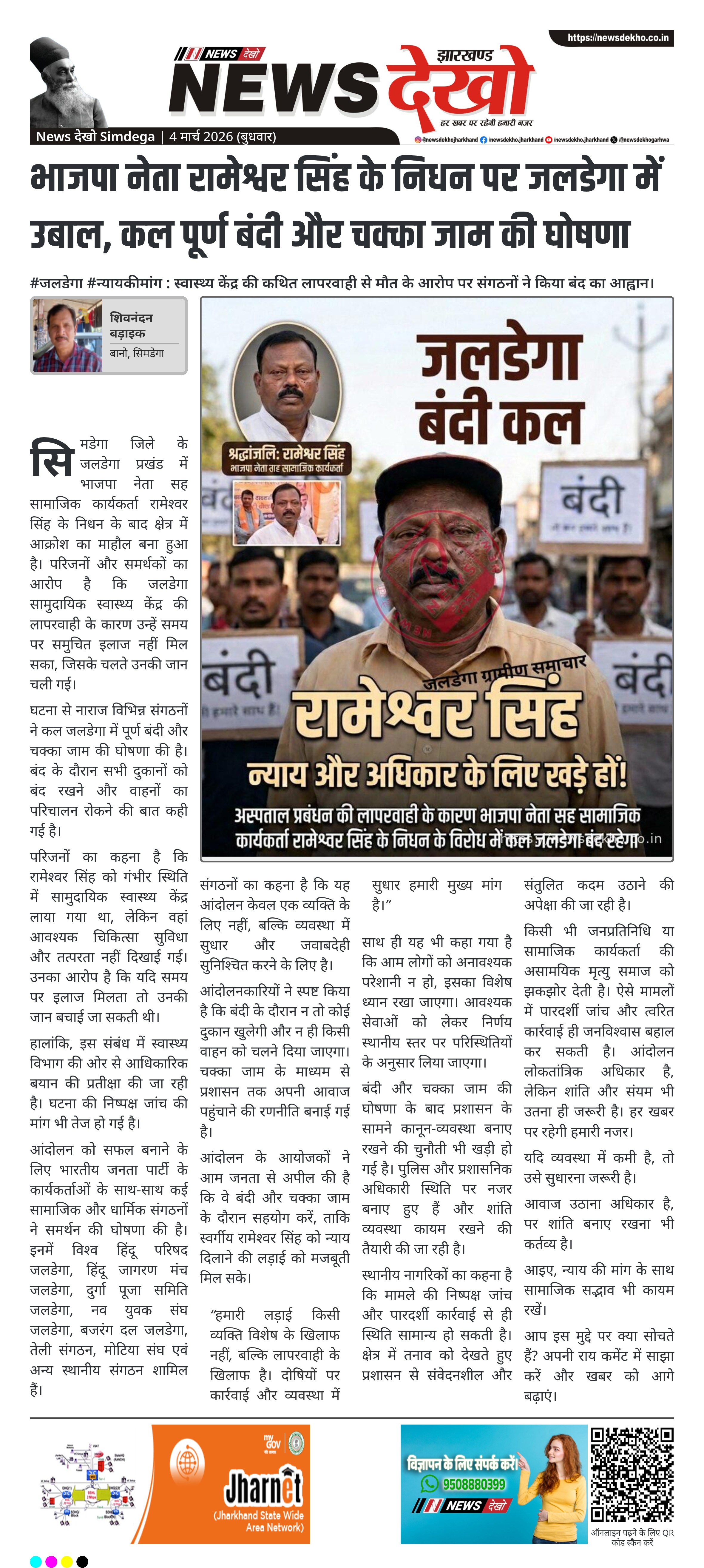 सिमडेगा जिले के जलडेगा प्रखंड में भाजपा नेता सह सामाजिक कार्यकर्ता रामेश्वर सिंह के निधन के बाद क्षेत्र में आक्रोश का माहौल बना हुआ है। परिजनों और समर्थकों का आरोप है कि जलडेगा सामुदायिक स्वास्थ्य केंद्र की लापरवाही के कारण उन्हें समय पर समुचित इलाज नहीं मिल सका, जिसके चलते उनकी जान चली गई।