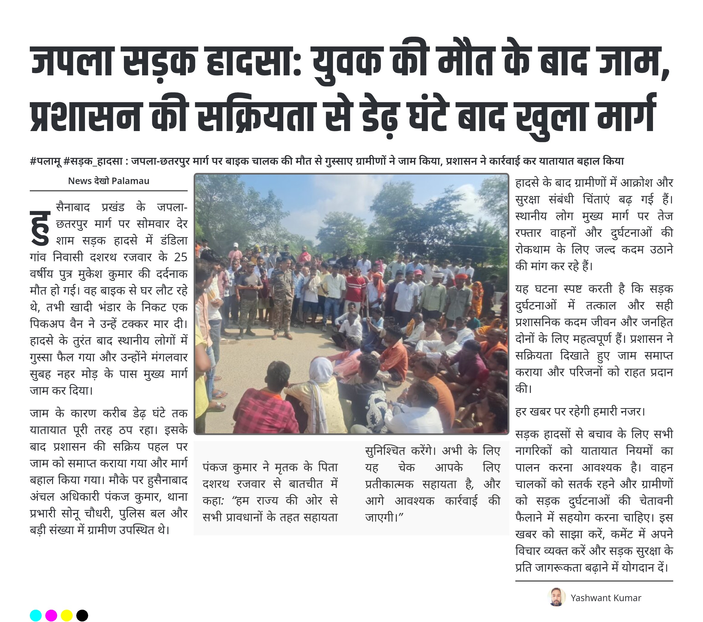 #पलामू #सड़क_हादसा : जपला-छतरपुर मार्ग पर बाइक चालक की मौत से गुस्साए ग्रामीणों ने जाम किया, प्रशासन ने कार्रवाई कर यातायात बहाल किया