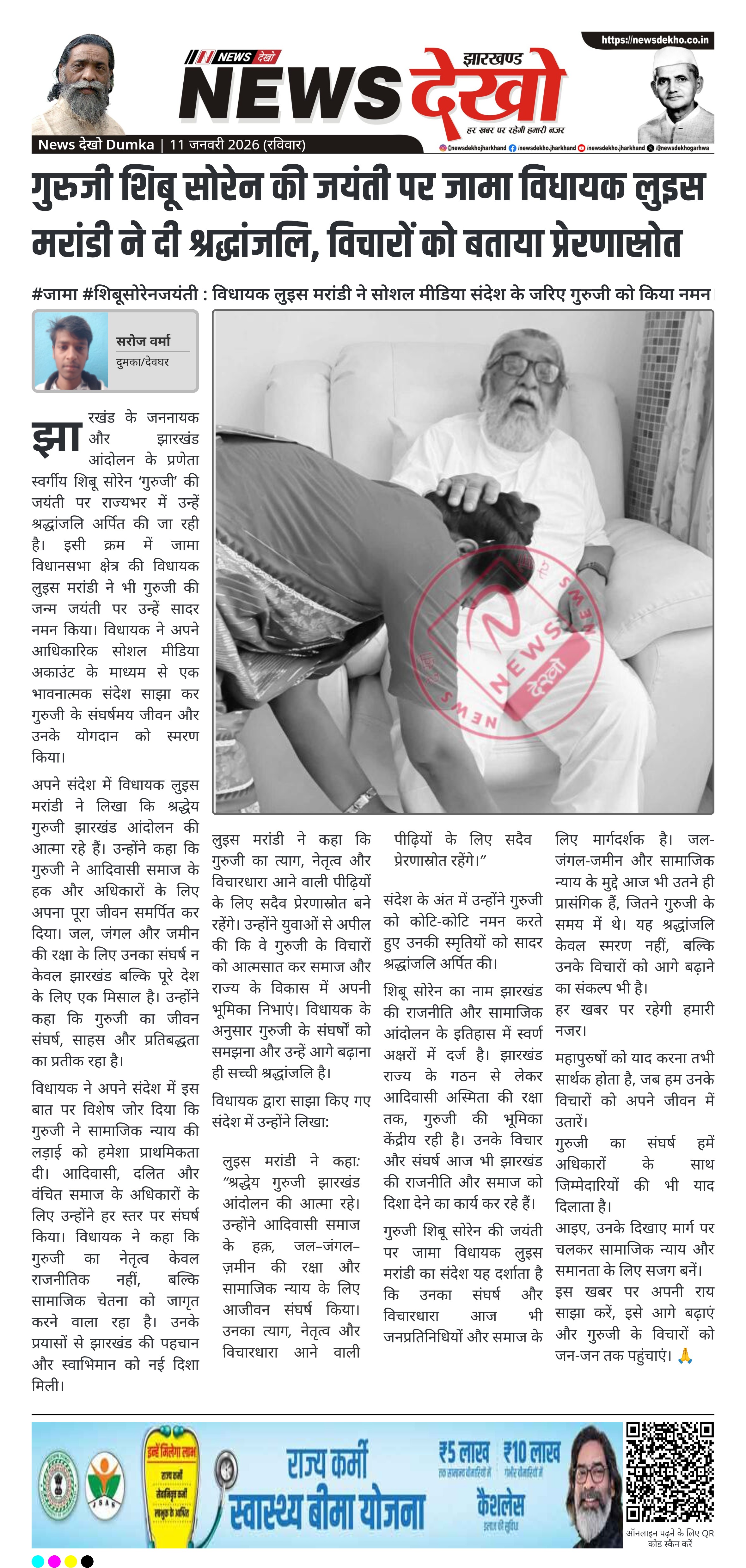 झारखंड के जननायक और झारखंड आंदोलन के प्रणेता स्वर्गीय शिबू सोरेन ‘गुरुजी’ की जयंती पर राज्यभर में उन्हें श्रद्धांजलि अर्पित की जा रही है। इसी क्रम में जामा विधानसभा क्षेत्र की विधायक लुइस मरांडी ने भी गुरुजी की जन्म जयंती पर उन्हें सादर नमन किया। विधायक ने अपने आधिकारिक सोशल मीडिया अकाउंट के माध्यम से एक भावनात्मक संदेश साझा कर गुरुजी के संघर्षमय जीवन और उनके योगदान को स्मरण किया।